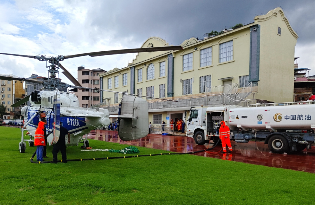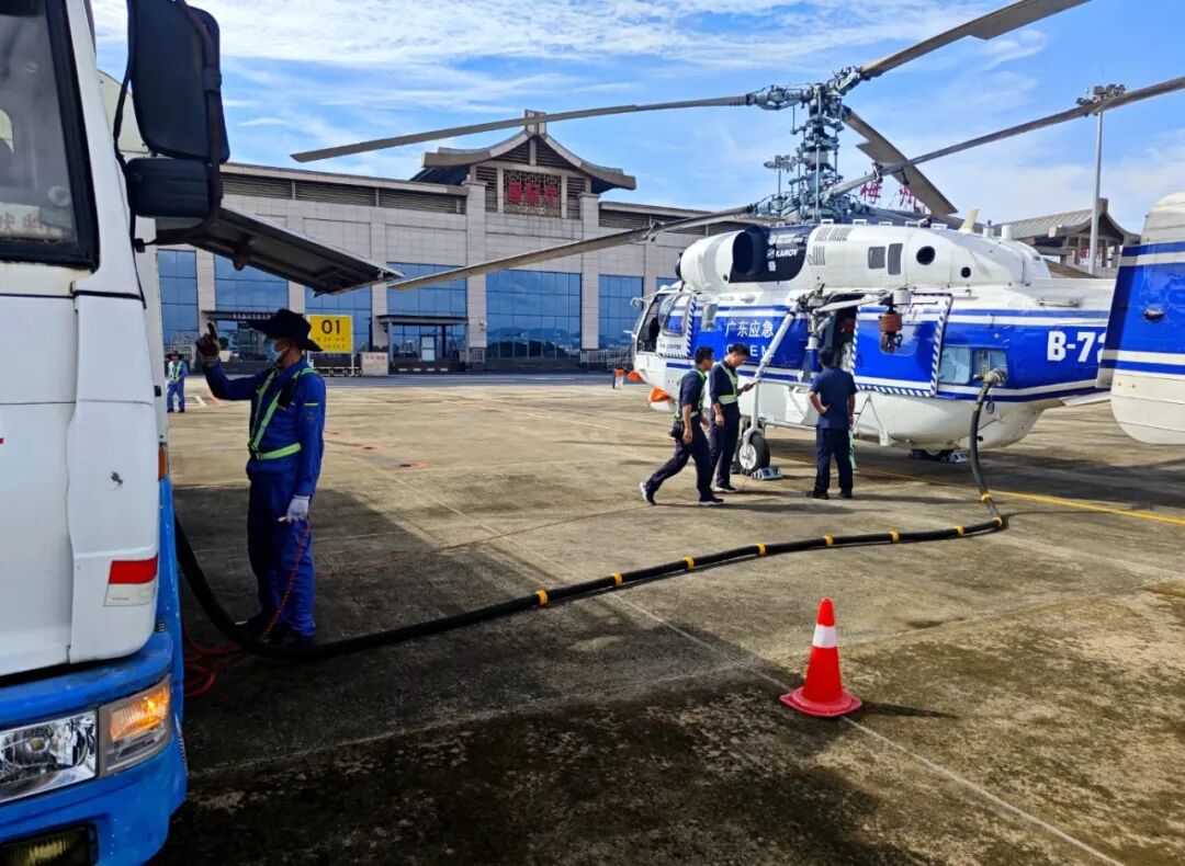 跟丘佳玉一样,广东销售梅州分公司很多员工家里也受了灾,但在洪水到来之时,他们都选择了坚守岗位。他们深知,加油站正常运营对当地抗洪抢险有多么重要。面对汛情,广东销售第一时间与昆仑物流公司联络,紧急调配油罐车和油品到站,为救援车辆做好服务保供工作,并将1.2万升柴油配送到救援前线,将100箱饮用水、速食食品、纸巾等救援物资送到平远县公益义工协会救援物资捐献点。6月17日,洪水还在持续,梅州多地被淹,受灾严重。多个村庄成为了道路中断、断水断电、通信中断的“孤岛村”,空中救援力量成为受灾民众的重要“生命通道”。广东省应急航空救援中心共出动5架救援直升机,在梅州市平远县、蕉岭县之间连续执行应急航空救援任务。![]()