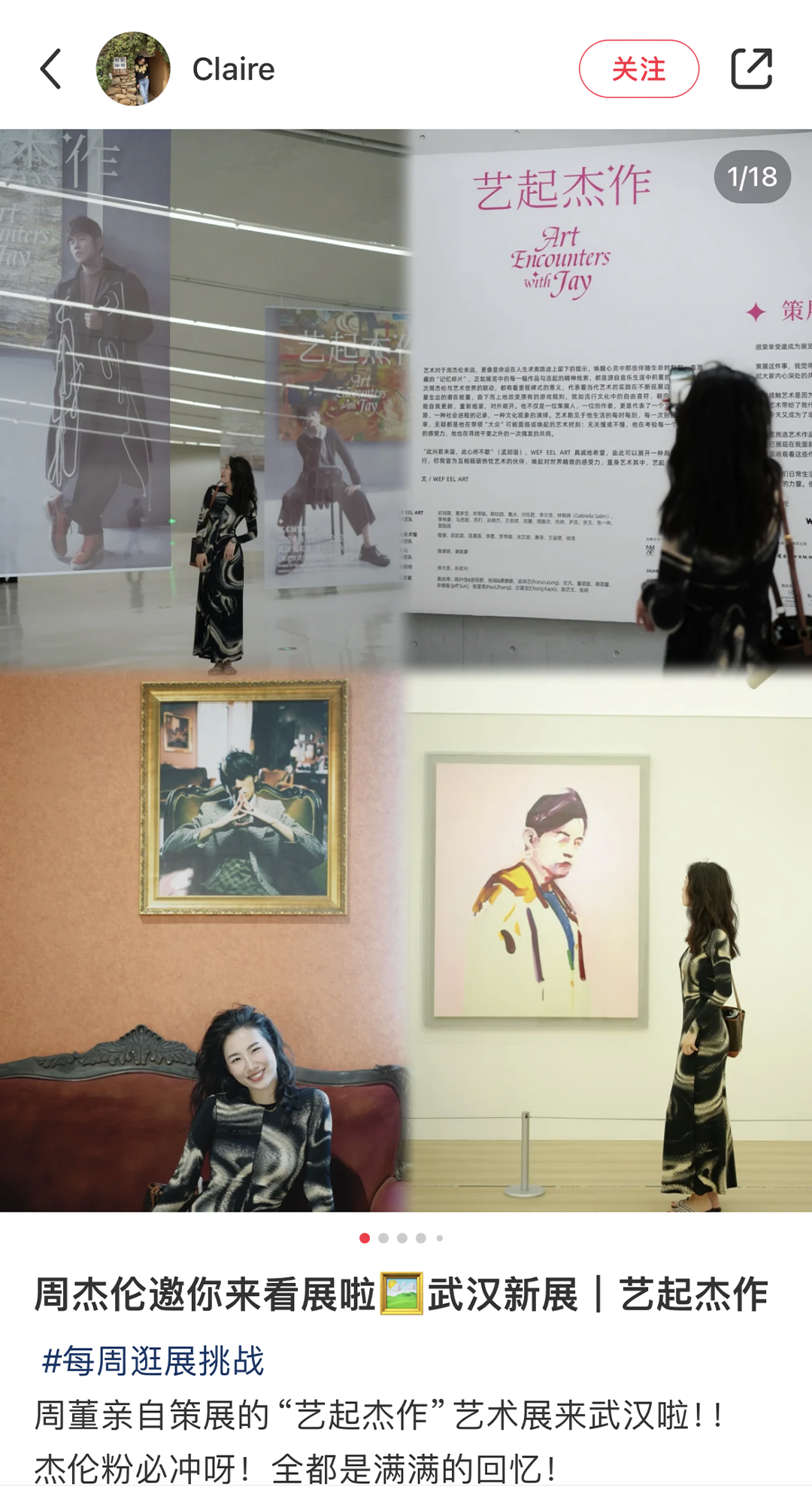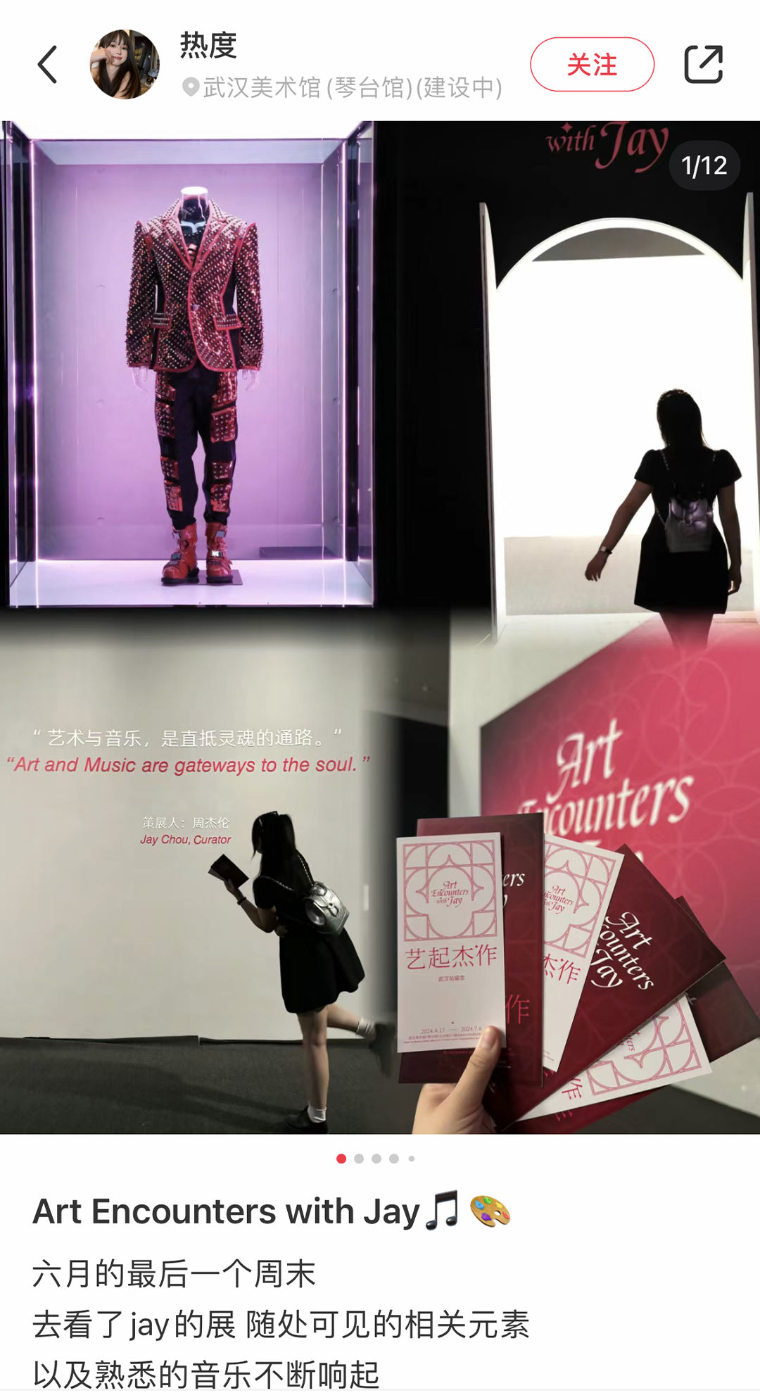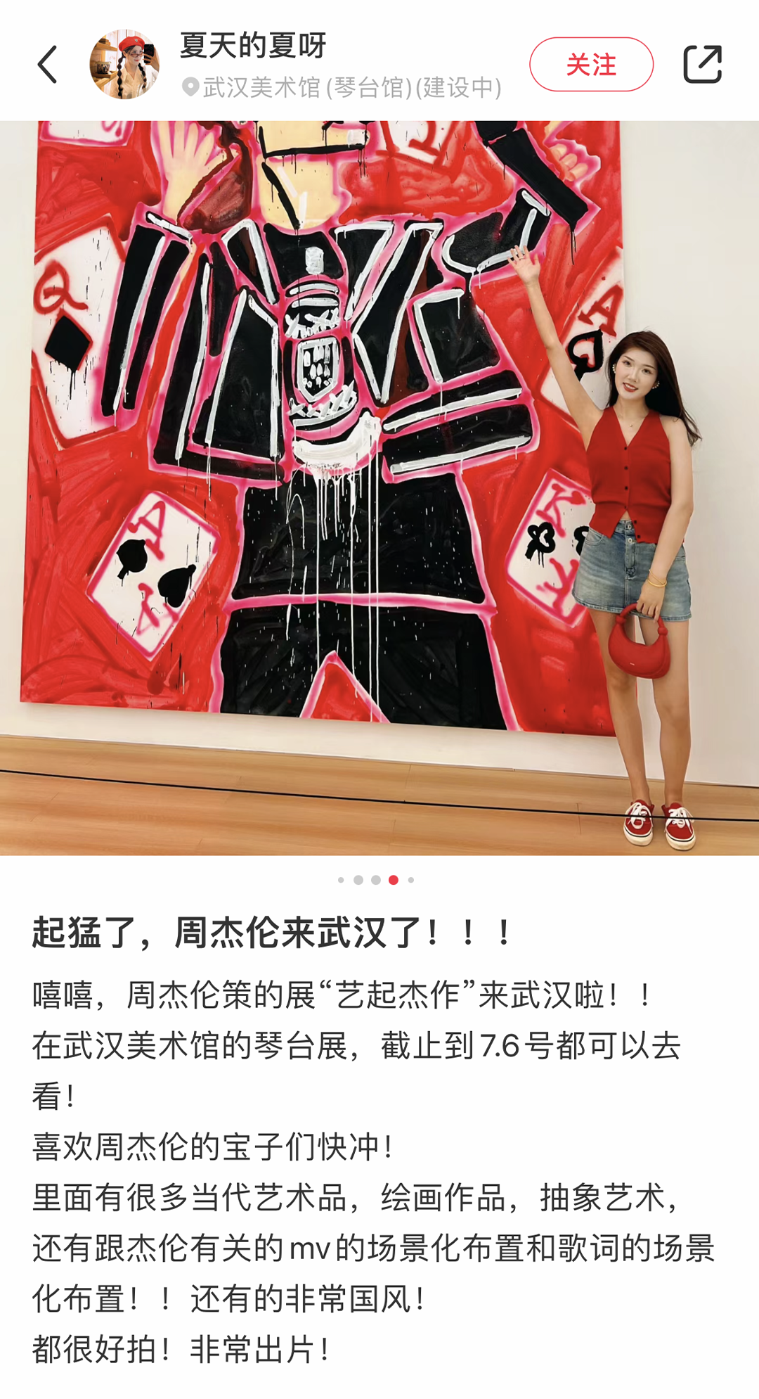 2024 年 4 月 17 至 7 月 6 日,由武汉市文化和旅游局指导, 武汉美术馆、万事如艺(北京)文化艺术有限公司、中鸿创艺(北京)文化发展有限公司、瀛识博睿(深圳)文化创意有限公司联合主办,华语流行乐天王周杰伦担当总策展人的《艺起“杰”作》艺术展于武汉美术馆(琴台馆)展出。巡展武汉站已于近期圆满落幕。