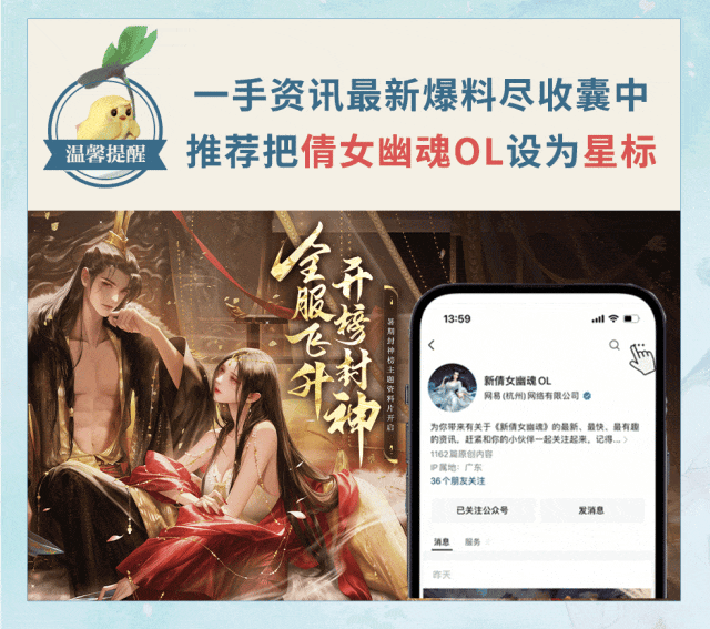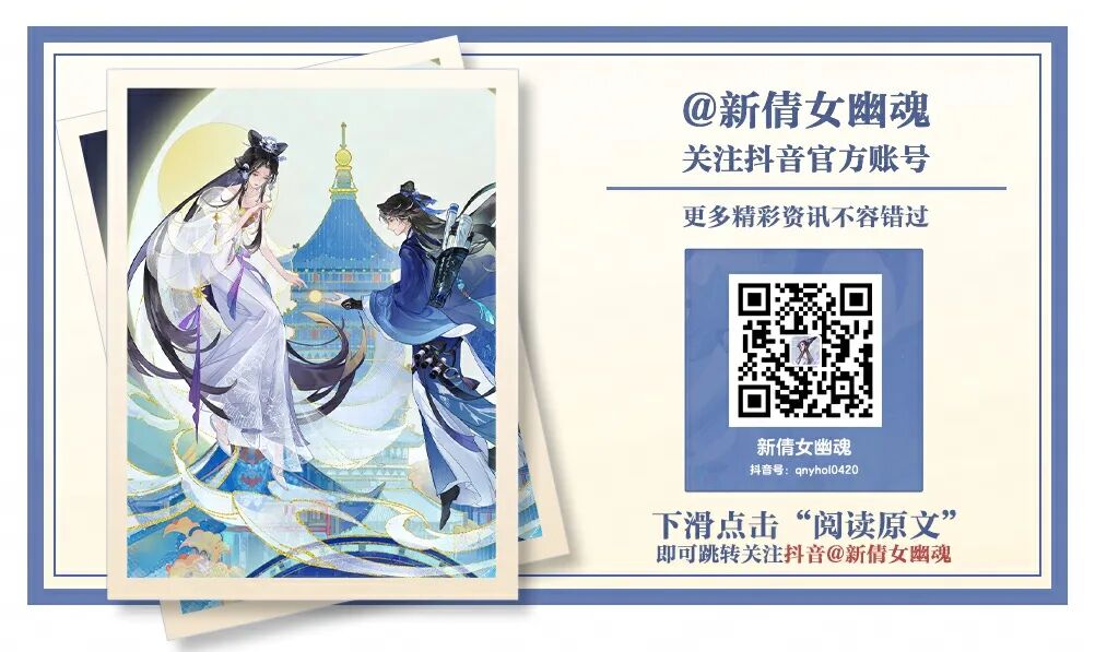 现在关注抖音官方账号@新倩女幽魂并发送关注截图+个人主页截图至微信公众号后台或微博,备注【抖音关注有礼】,即有机会获得【随机款鼠标垫】一份哦~