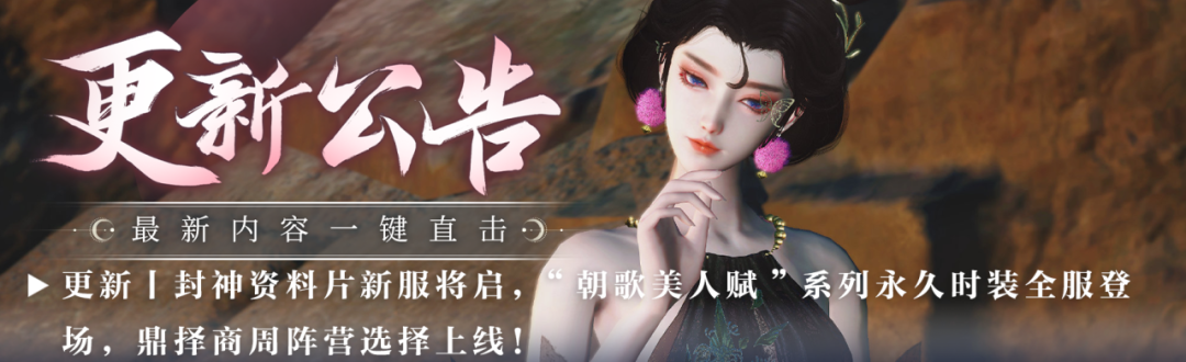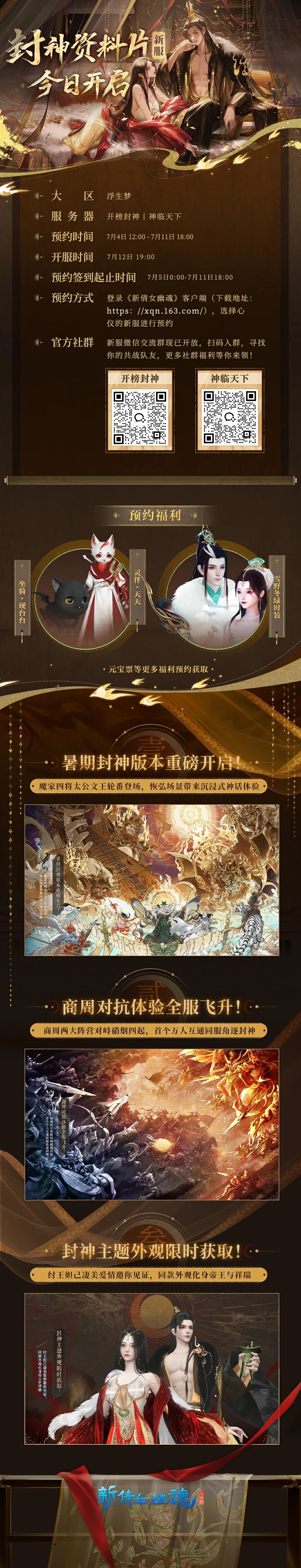 不用再想了!今天19:00,封神新服【开榜封神】和【神临天下】正式开放!全新封神剧情上线,引领你我揭秘那些隐匿于天地间的古老传说;氛围场景登场,自由穿梭于封神大世界的每一个角落;纣王妲己同款永久时装·天歌朝岁等少侠来拿,还有万人大服即将开启,一起体验神魔血战的快感,诚邀诸侠一键超脱尘世烦恼,列为封神,飞升九天!