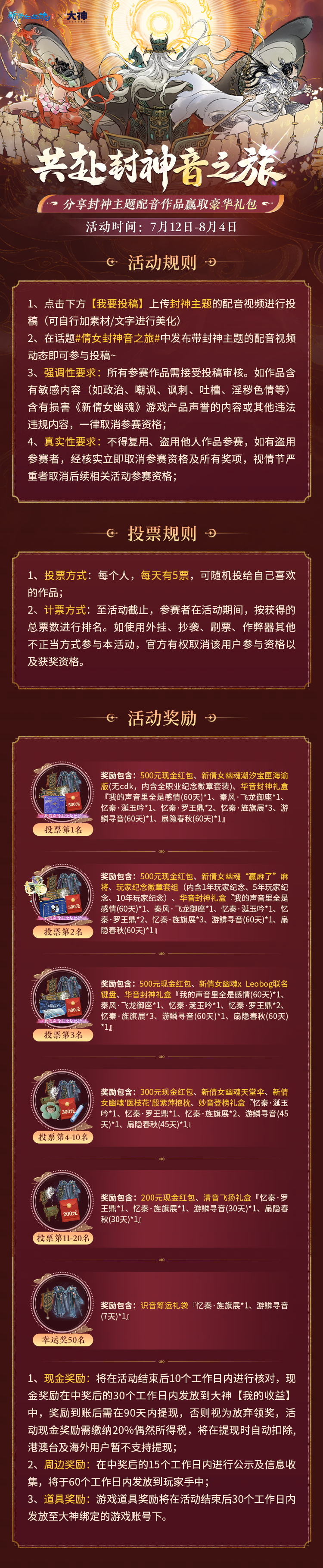 在网易大神活动页面内点击【我要投稿】,上传少侠精心制作的封神主题配音视频或在网易大神话题#倩女封神音之旅#中发布你的作品动态,即可参与投稿~投稿即有机会获得现金奖励、新倩女幽魂13周年定制周边及海量珍稀游戏道具,荣耀加冕,实至名归!