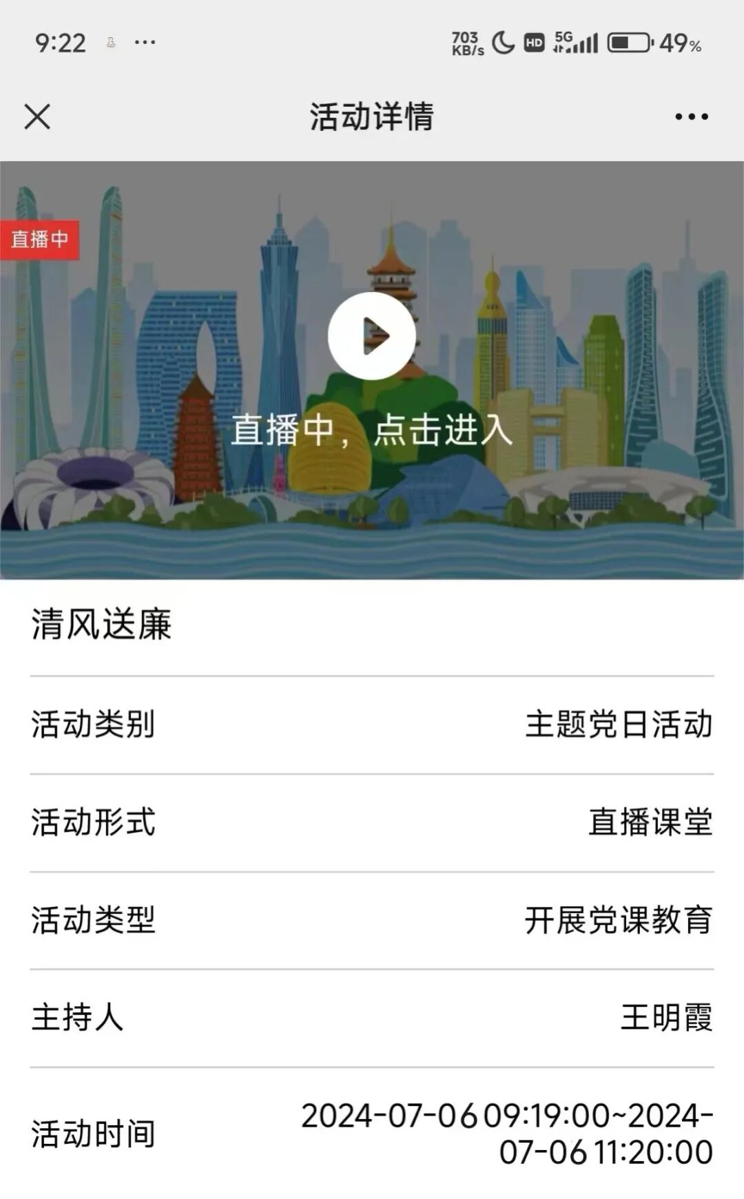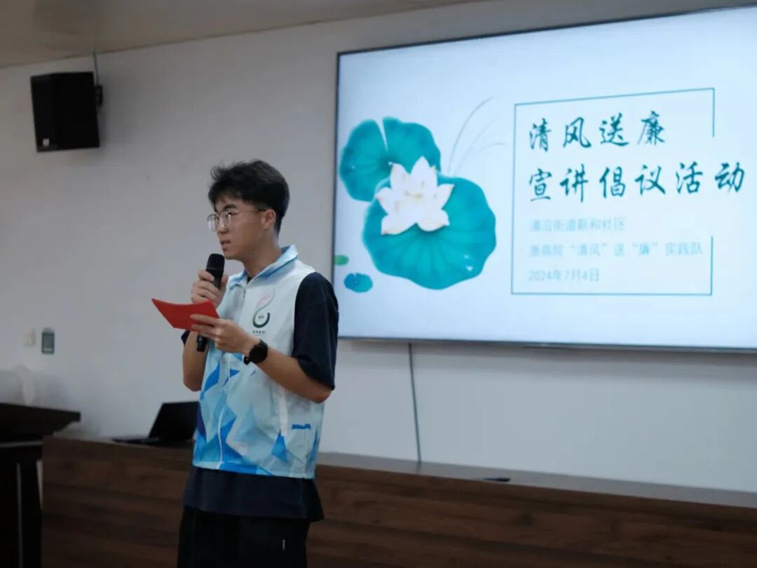 实践队成员陶佳琦以饱满的热情为社区居民带来了一场精彩的清廉主题知识宣讲。通过生动的案例、深入浅出的讲解,让在场的每一位听众都对廉洁文化有了更加深刻的理解和认识。此次的活动还采取了线上线下相结合的方式,让其他没有到现场的社区成员在手机上也能“云参与”,聆听廉洁之声,让更多的人感受到廉洁文化带来的魅力。在清廉故事宣讲的后半段,进行了有奖竞答环节,社区成员们非常热情,大家纷纷举手抢答,现场气氛热烈而欢快,加深了大家对廉洁文化的理解和认同。