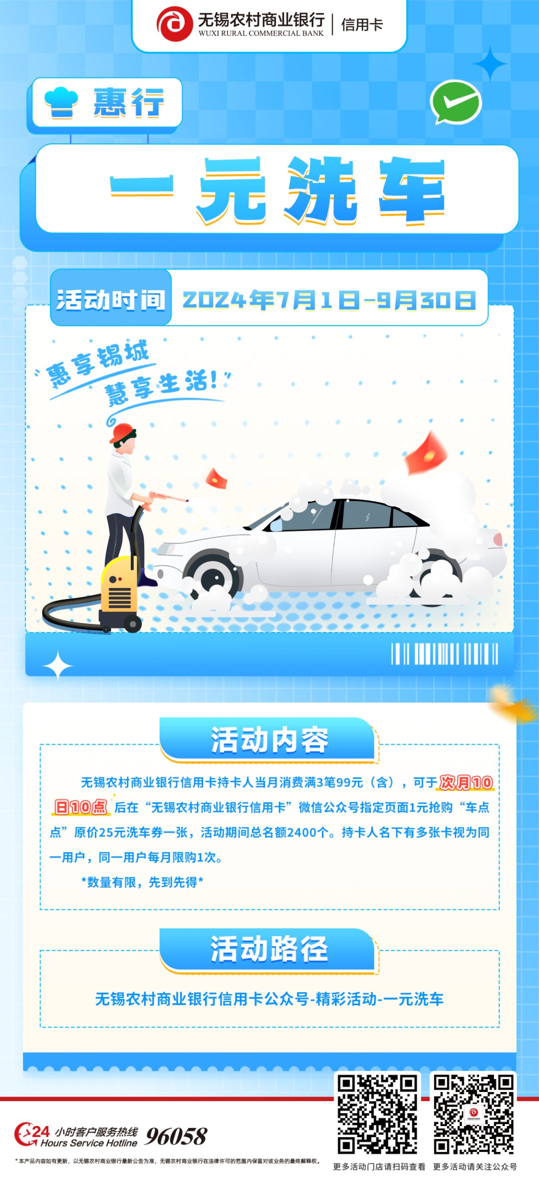 无锡农村商业银行信用卡持卡人当月消费满3笔99元(含),可于次月10日10点后在“无锡农村商业银行信用卡”微信公众号指定页面1元抢购“车点点”原价25元洗车券一张,活动期间总名额2400个。持卡人名下有多张卡视为同一用户,同一用户每月限购1次。*数量有限,先到先得*