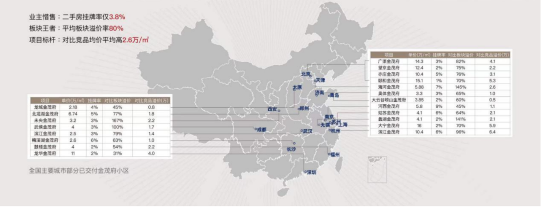 不止于北京,盘点全国已交付的金茂府,因业主惜售,二手房挂牌率仅3.8%,平均板块溢价率80%,价格对比竞品均价平均高2.6万/㎡,成为穿越周期的恒强保值资产。