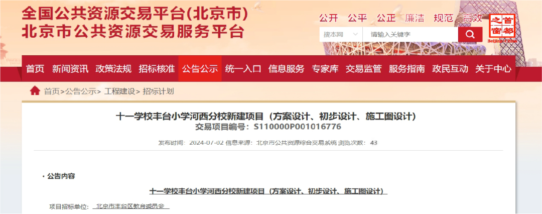 近日,北京市丰台区教育委员会发布《十一学校丰台小学河西分校新建项目(方案设计、初步设计、施工图设计)公告》,近期将启动十一学校丰台小学河西分校新建项目招投标,预计总投资19938.95万元,项目总用地面积32602.528平方米,拟建总建筑面积27036.13平方米,包括主要教学用房、办公及管理用房、生活服务用房、室外运动场地、广场及道路、绿化等。