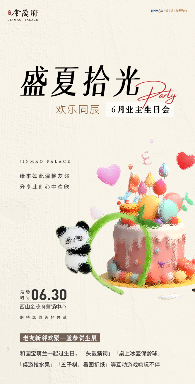 “金茂华北15周年 金邻生日会”美好来袭,启幕欢乐相聚的盛宴,聆听邻里交融的欢声笑语,共贺业主生辰的喜乐时光。6月30日,西山金茂府「盛夏拾光 欢乐同辰」6月业主生日会开启,和国宝萌兰一起过生日,「头戴猜词」、「桌上冰壶保龄球」、「桌游抢水果」、「五子棋、看图折纸」等互动游戏嗨玩不停,一起切蛋糕,享受金茂式生日喜悦。老友新邻欢聚一堂,到访西山金茂府售楼处参加6月业主生日会,同时选择心仪好房享受专属礼、直减礼、车位礼等超值年中特惠,一次全收获!年中特惠倒计时,年中抄底正当时,即刻入住金茂府!
