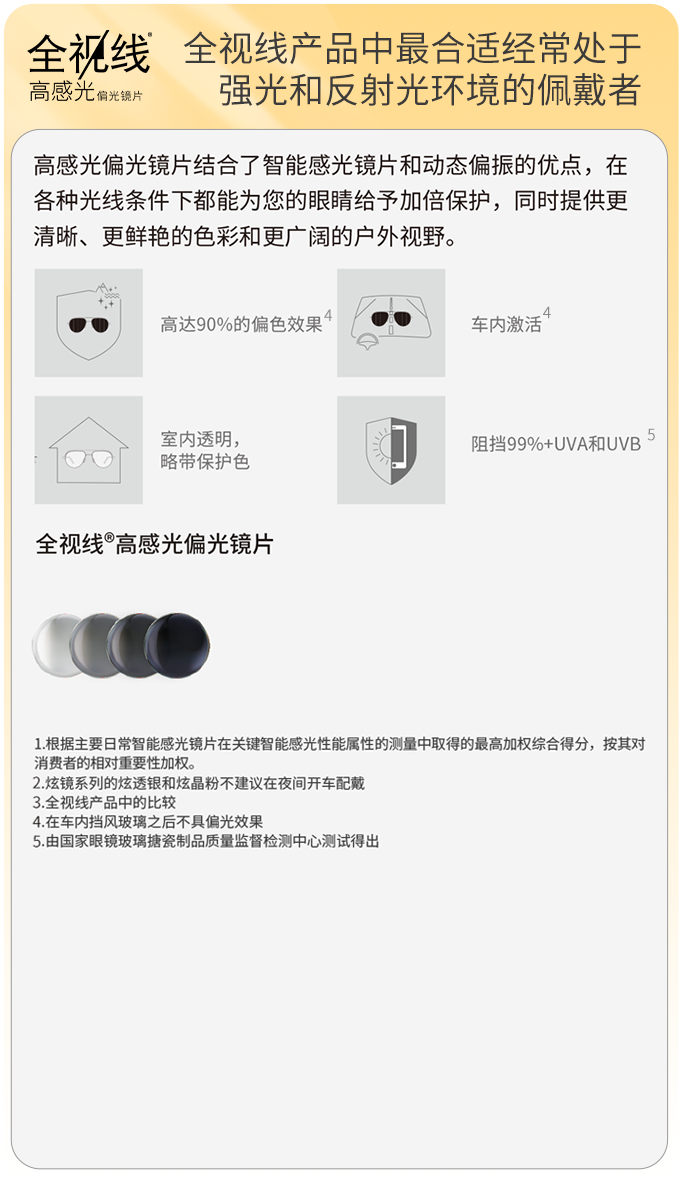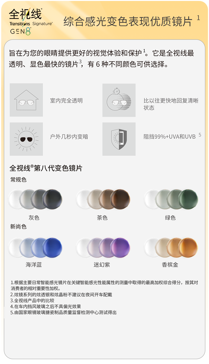 全视线®智能感光变色镜片是第一个获得“紫外线防护镜片”认证的光学镜片,有世界组织的认证,请放心选择!
