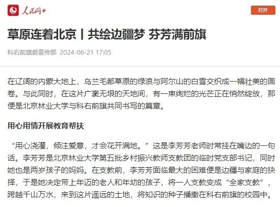 “用心浇灌,倾注爱意,才会花开满地。”这是李芳芳老师时常挂在嘴边的一句话。李芳芳是北京林业大学第五批乡村振兴教师支教团的临时党支部书记,同时她也是两岁孩子的妈妈。在支教前,李芳芳面临最大的困难便是边疆与家庭的抉择,于是她决定带上年迈的老人和年幼的孩子,将一人支教变成“全家支教”,跨越千山万水,来到这片遥远的土地,将知识的种子播撒在科右前旗的校园中。
