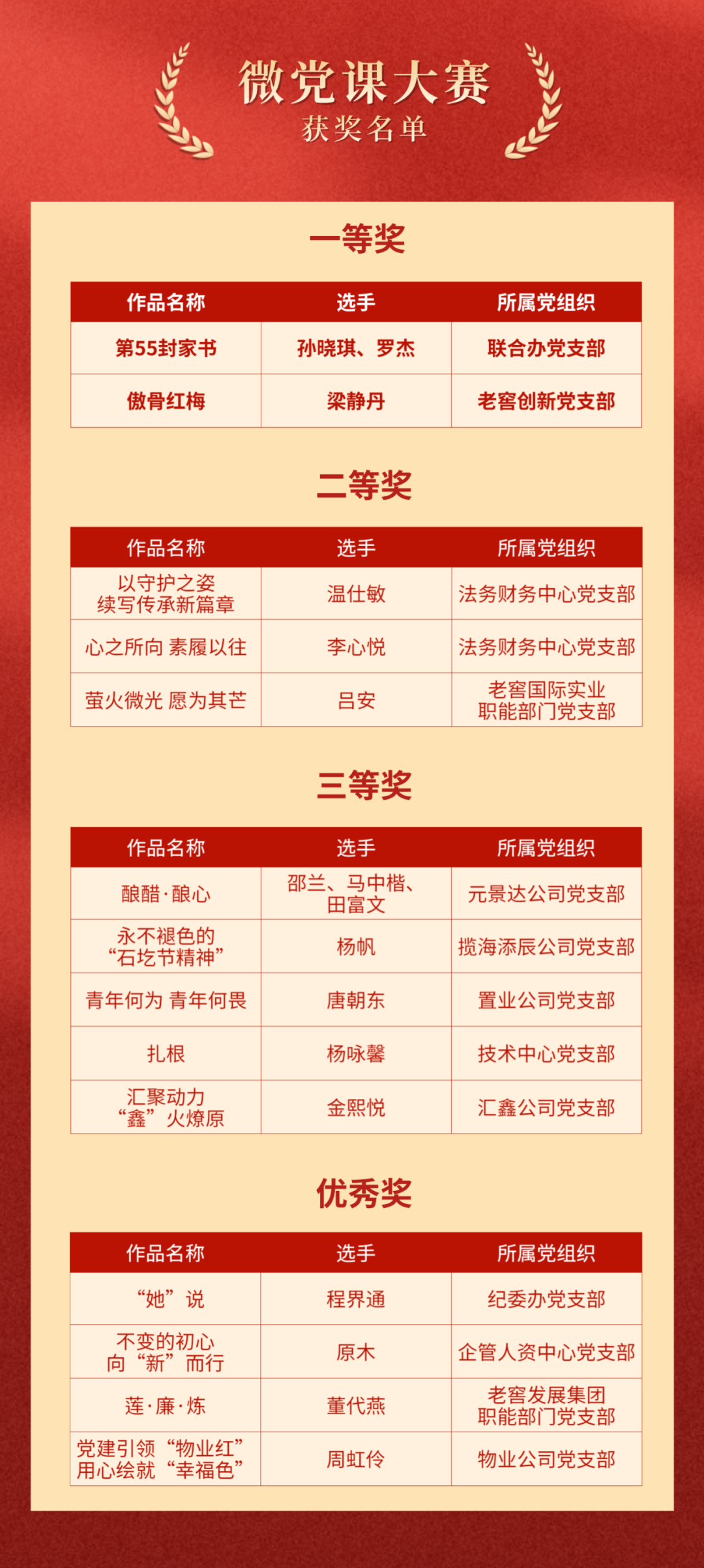此次“薪火相传守初心 奋楫扬帆新征程”微党课大赛营造了争先创优、比学赶超的浓厚氛围,促使广大党员见贤思齐,激发起勇立潮头、奋发有为的内生动力。接下来,公司党委将进一步推动微党课品牌化、常态化、长效化,对优秀微党课作品进行展播,持续做好学习贯彻党的创新理论的深化、内化、转化工作,提升党员教育工作质效,引导广大党员自觉做习近平新时代中国特色社会主义思想坚定信仰者和忠实实践者,进一步推动党建与业务深度融合,以高质量党建引领企业高质量发展,为中国式现代化建设贡献泸州老窖力量。
