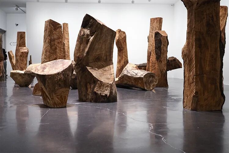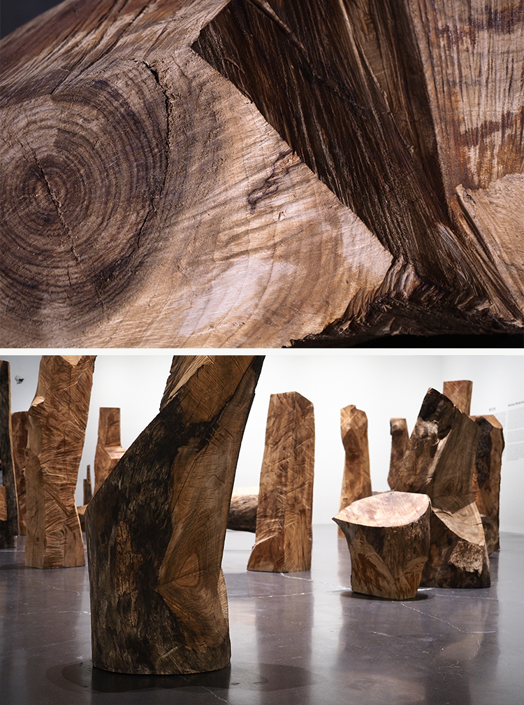 在展览“步虚”中展出的《无题(切割)》系列,是梁好用链条锯对原木直接切割而成。《无题(切割拼接)》系列,是在切割的基础上融入了穿插和重组。它们采用了雪松、香樟等树木,高大浑圆,每一个方向上的切割都要使出全身力量。动作的轻重、缓急、顿挫,创造出不同的线条、平面与肌理,平整、崎岖或流滑。这些形态和质感从来都不是预设,它们与艺术家工作的现场感紧密相连,“时间”凝练其中。同时不同角度的切割也创造出各异的结构,它们的背后是多维的“空间”。对于时空的探索持续推进,梁好将这些独立自足的个体拼接组合排布,对于轻重、大小、疏密关系的处理又营造出无穷变化。“芴漠无形,变化无常。”不矫饰的原木在此生发出崇高凝重、超越现实的意境,雕塑的本体语言得以丰富。