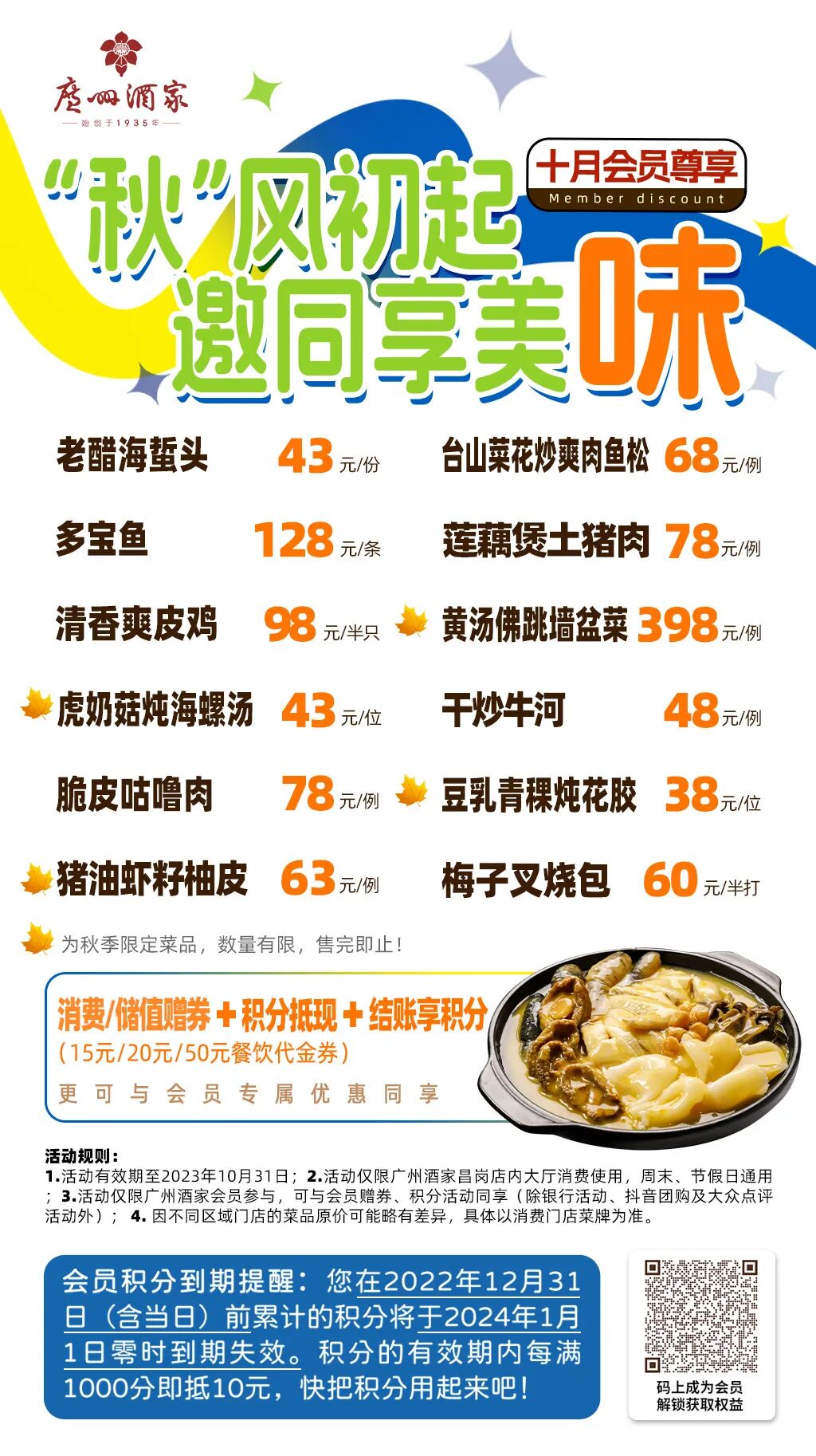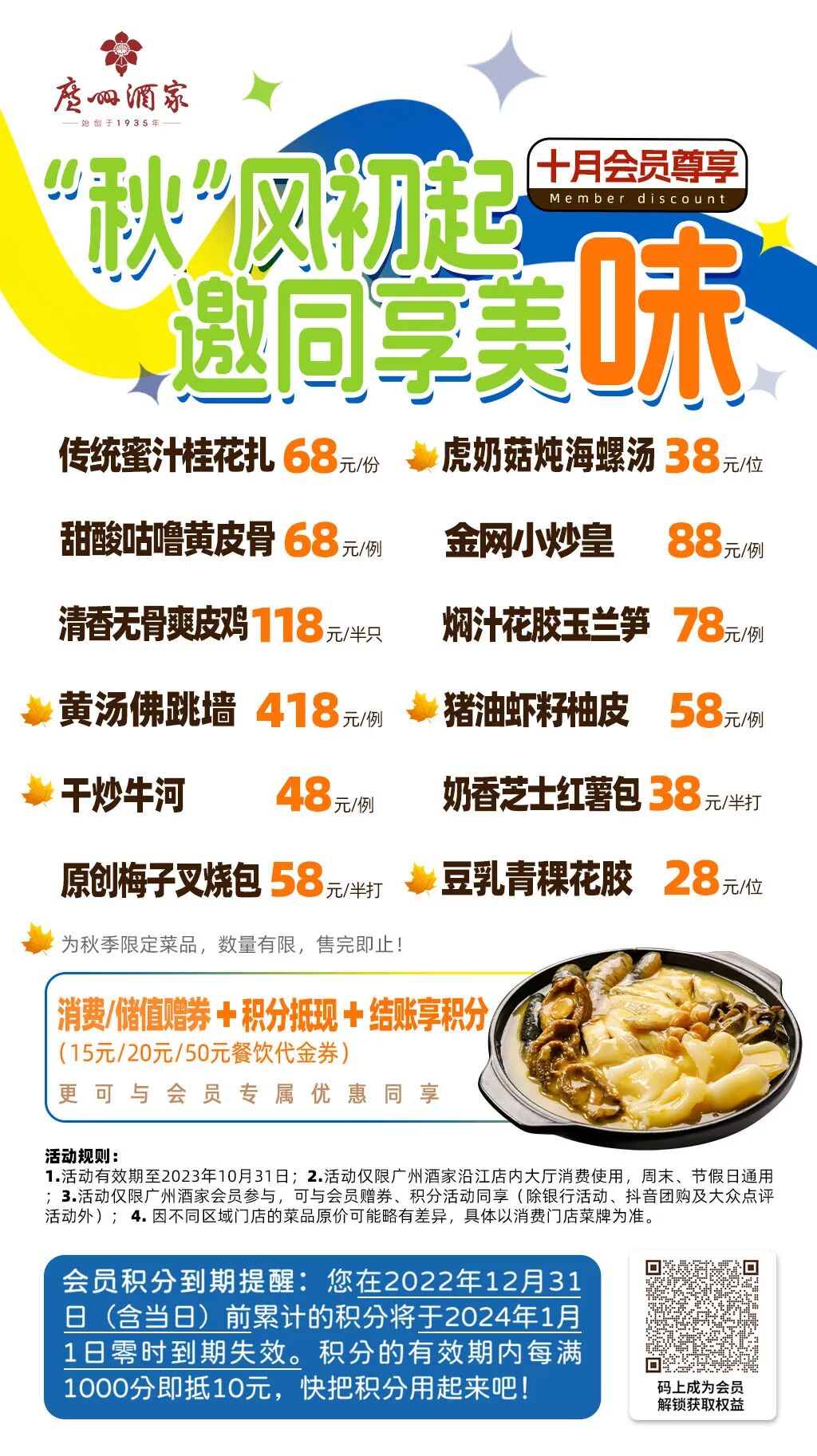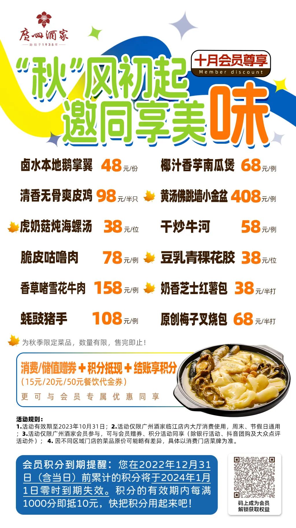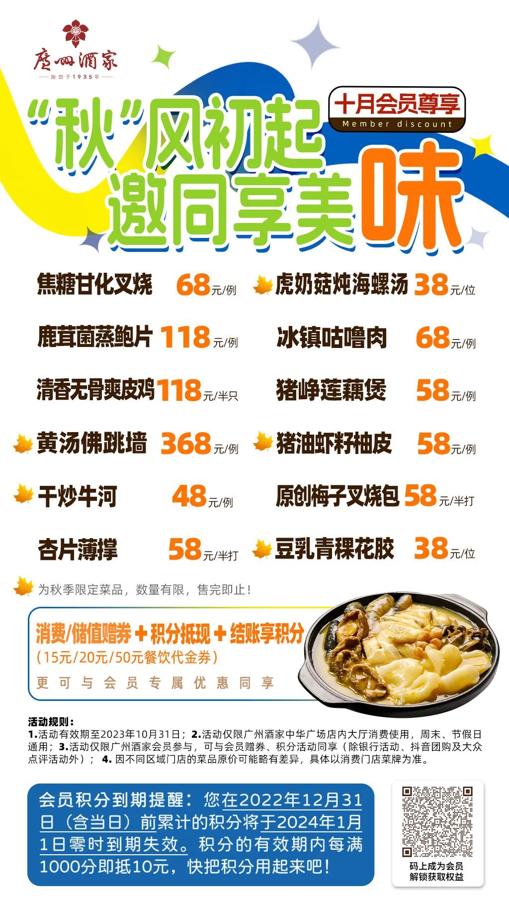 ③专属会员价活动仅限广州酒家会员身份可使用,不与店内其他银行活动、抖音团购等第三方平台活动同享;