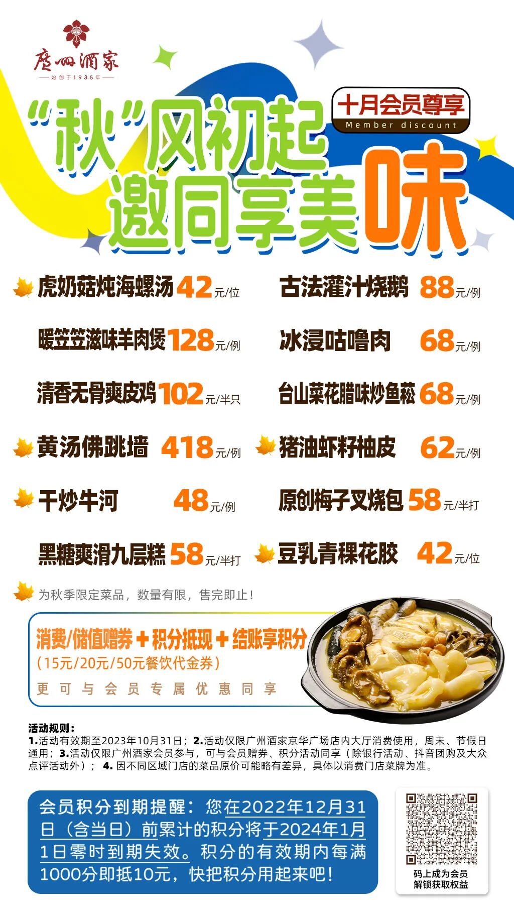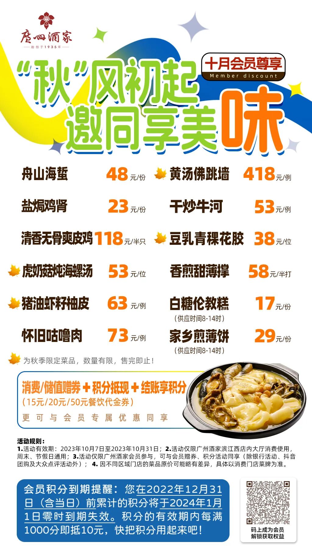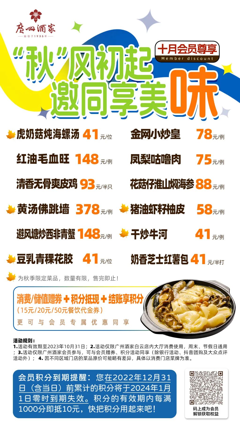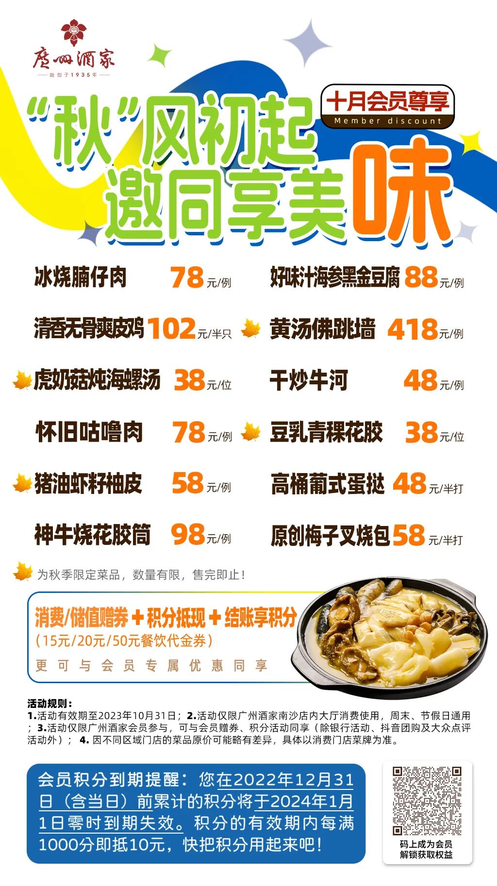 ③专属会员价活动仅限广州酒家会员身份可使用,不与店内其他银行活动、抖音团购等第三方平台活动同享;