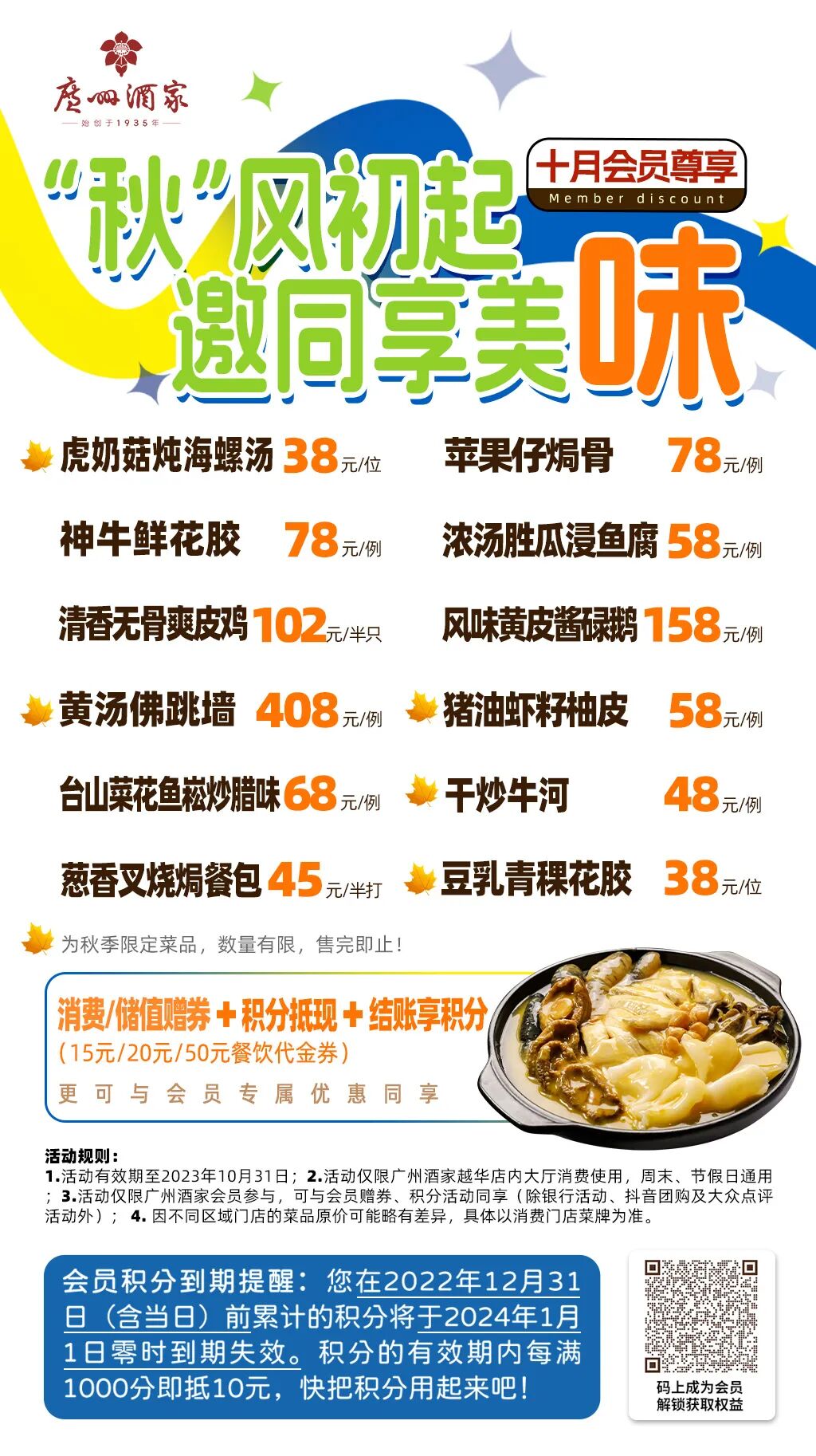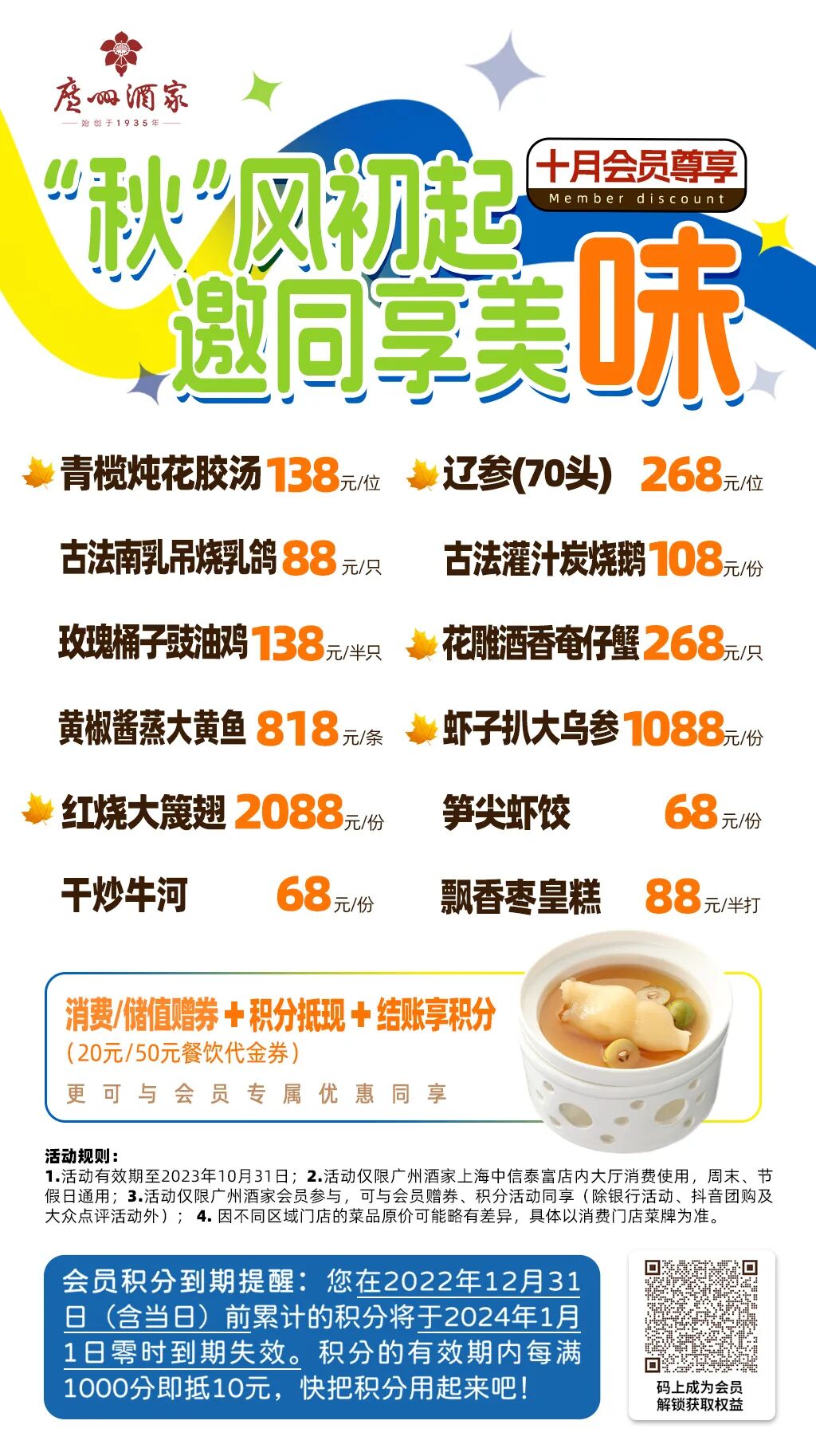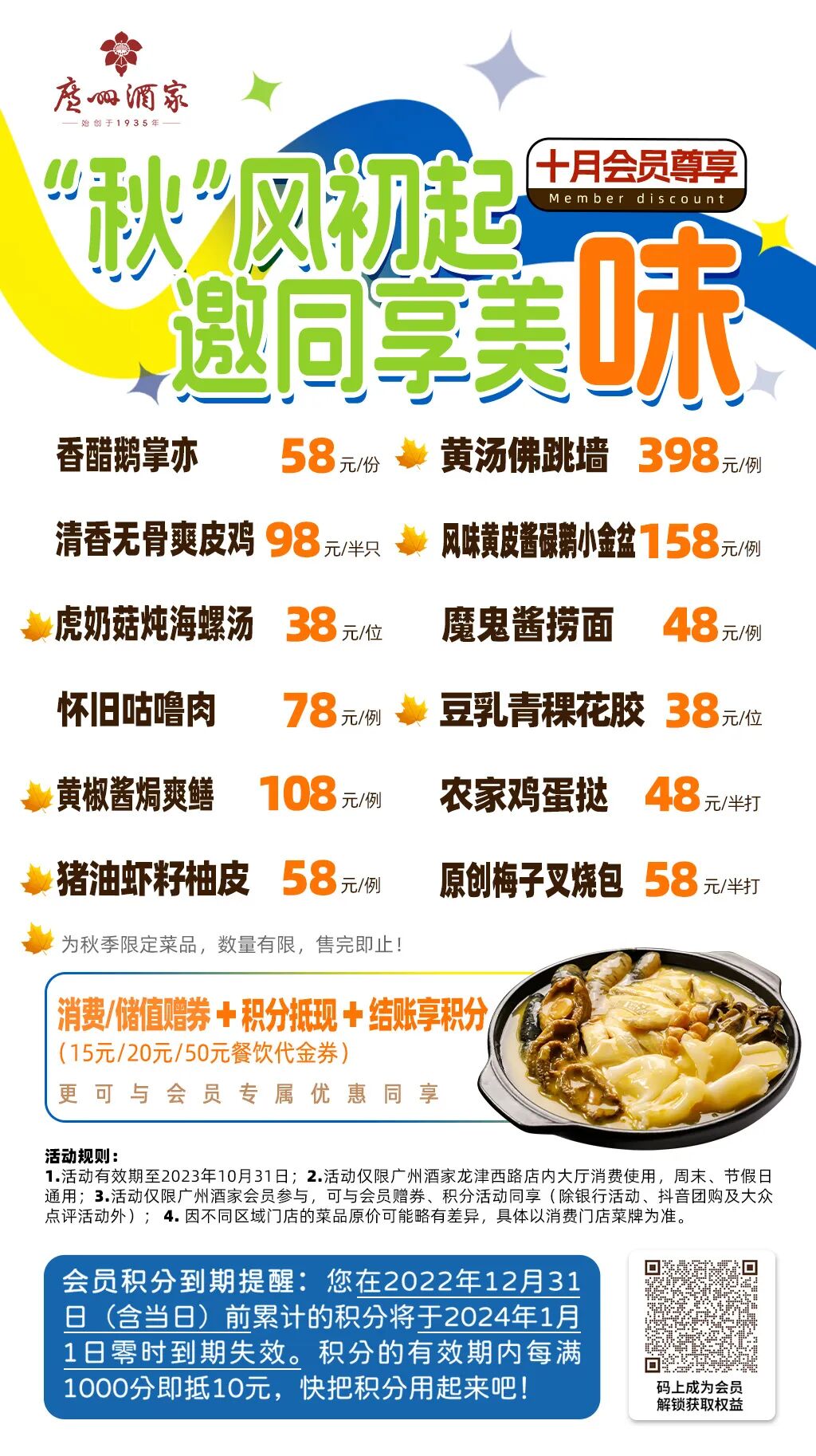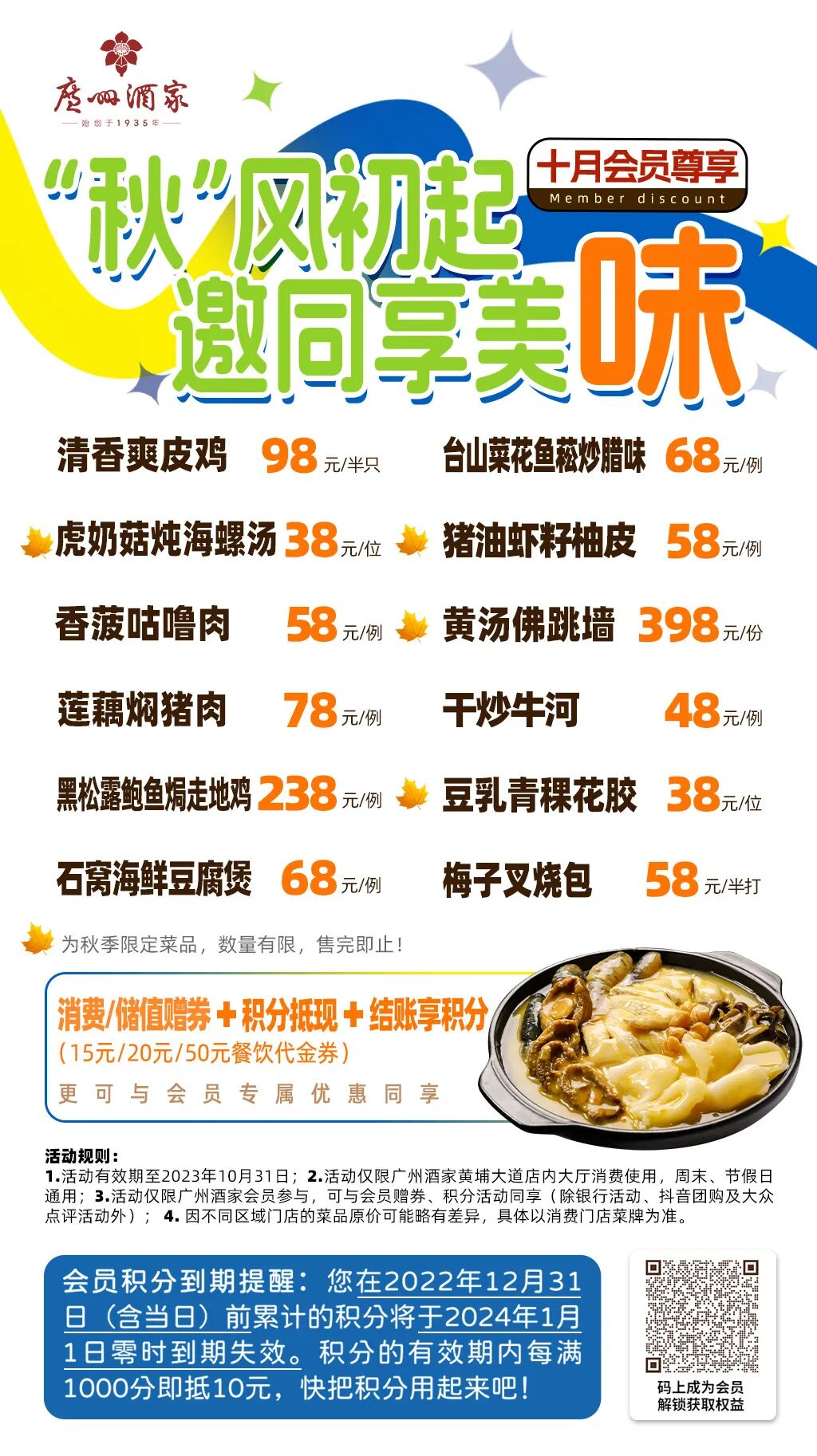 ③专属会员价活动仅限广州酒家会员身份可使用,不与店内其他银行活动、抖音团购等第三方平台活动同享;