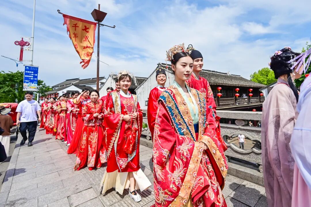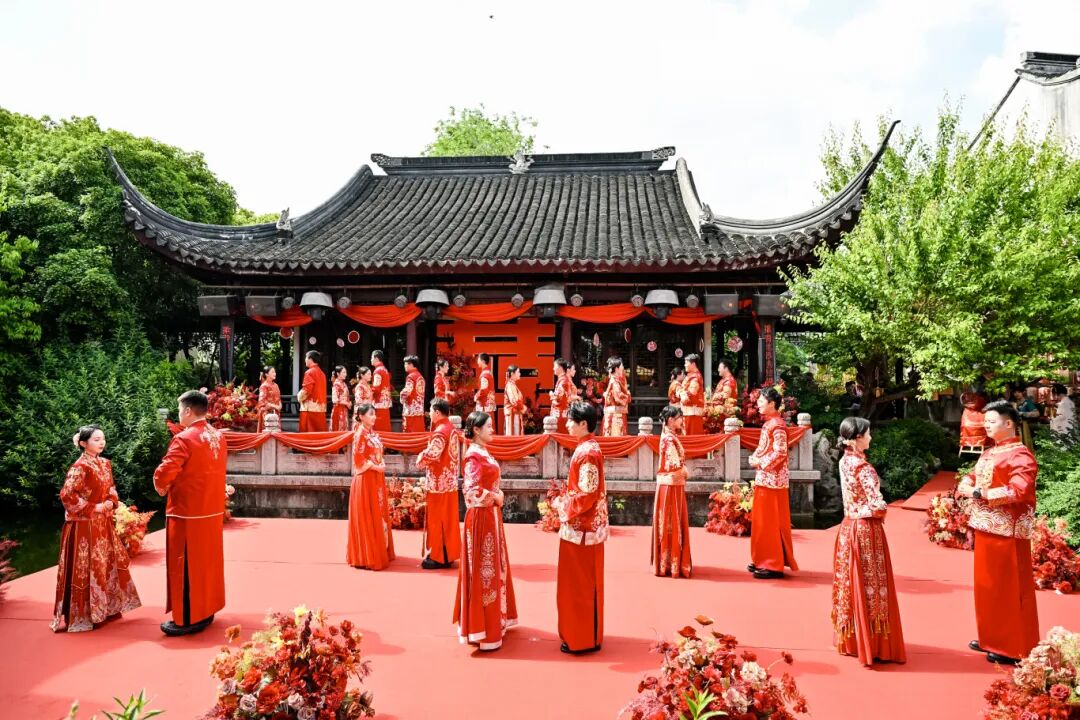仪式现场,嘉宾为新人举行了融入传统婚俗的集体颁证仪式,发布了“乘者地铁去结婚”主题曲,并邀请苏州大学文学院教授杨旭辉进行“山塘情韵,爱之涟漪”苏州本地爱情文化分享。现场传统婚俗、江南婚服、昆曲表演等系列展示,引领大家沉浸式感受江南婚恋的浪漫唯美。