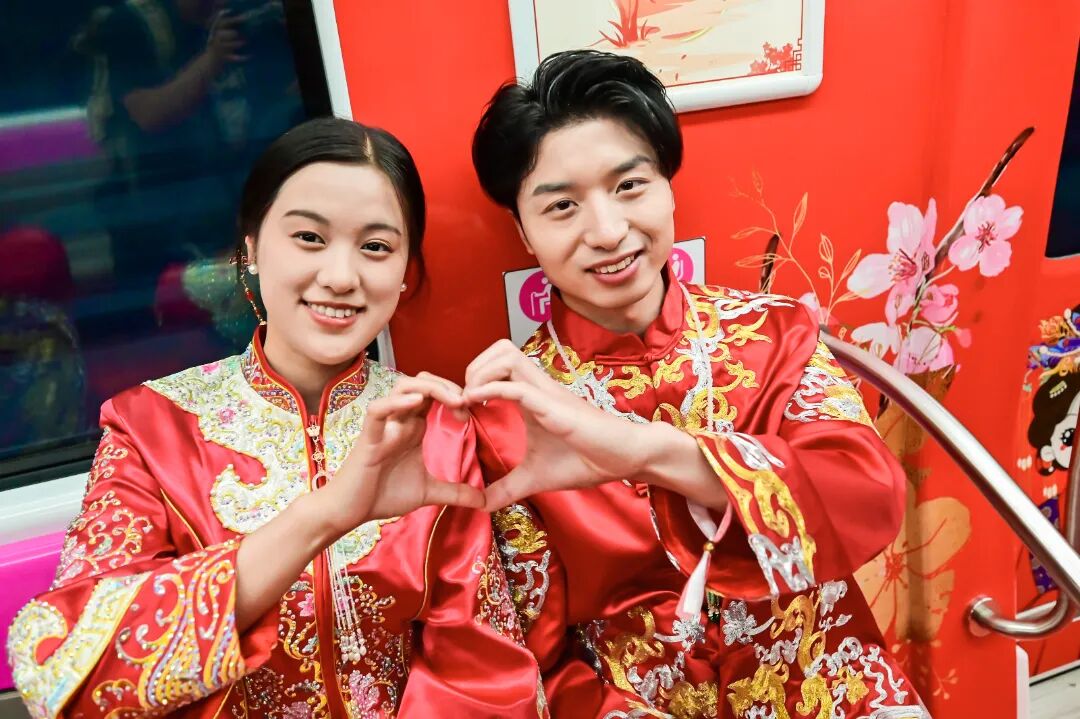 途中,新人们甜蜜互动,并向乘客发放喜糖和玫瑰花分享喜悦,乘客也纷纷驻足为新人送上祝福。