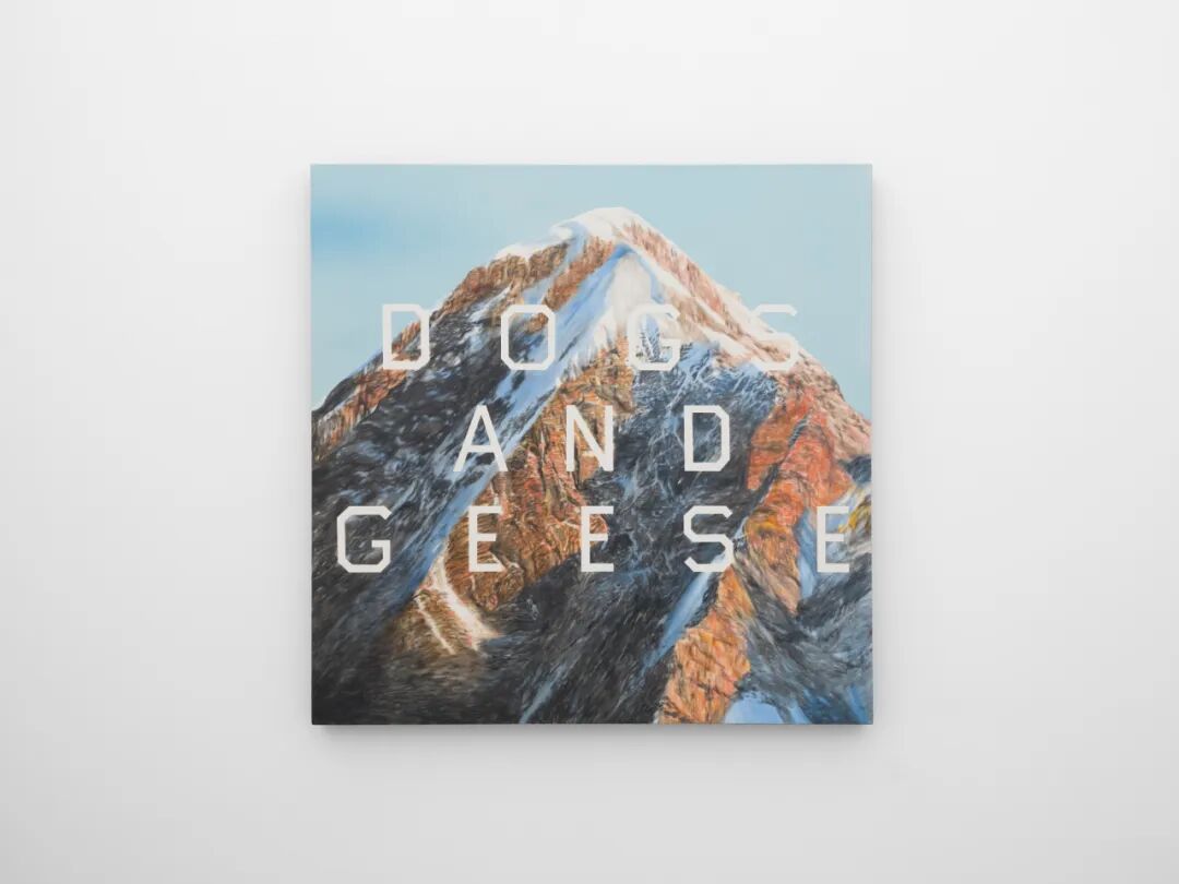 他的作品《狗与鹅》,是一场充满诙谐的文字游戏,一次视觉与语言相互冲突的冒险创意。通过绘制三个看似无关的词汇,映衬在逼真的山脉背景前,创造了一种超越画面本身的语言。这些词汇在自然与人工景观的结合中,仿佛像是在自然风光中插入了一段电影对白。