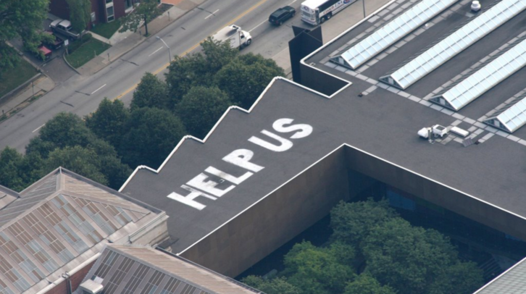 此外,艺术家布拉德福德在洛杉矶的一座建筑屋顶上创作了装置艺术作品《帮助我们》。他用白色石头拼写出"HELP US",以此代替飓风卡特里娜的受害者发出呼吁。这件作品安置在一个开阔地带屋顶,却不易直接观看。最佳的观赏视角是乘坐飞机俯视,这种独特的设置既是艺术表达,也隐喻了政府对灾难的应对方式——直升机搜求。