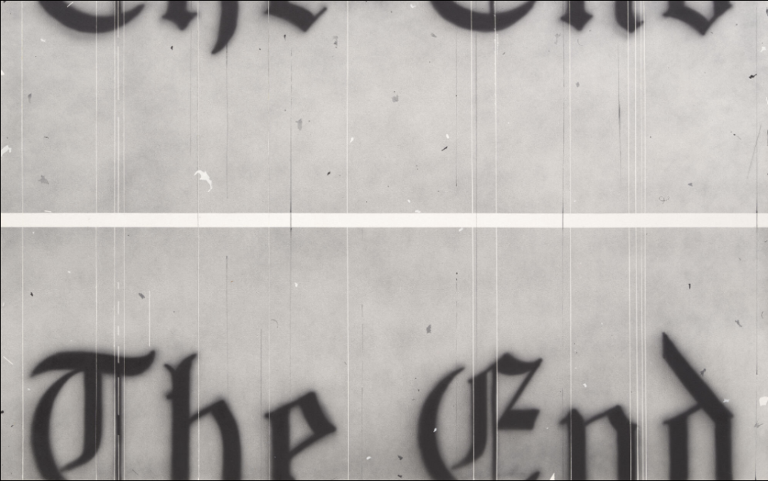因为拉斯查长期居住在洛杉矶,这座城市的电影业对他的视觉艺术风格也产生了深远的影响。《The End》系列作品通过复制电影片尾的部分画面,传达了梦想可能的"结束"这一概念,是对电影艺术和其终结性的一种深刻反思。我们可以看到画面中的单词被水平分割,仿佛放映机中的胶片出现了故障。这像是电影滚动到停止的状态。