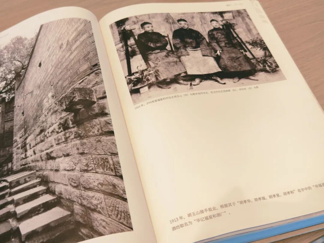 书中照片为1910年,泸州老窖福星和作坊、鼎丰恒作坊、定记作坊主胡玉山、胡焕章、胡忠恕合影,胡氏家族的浓香型大曲酒酿在泸州,销在重庆,饮在全国。