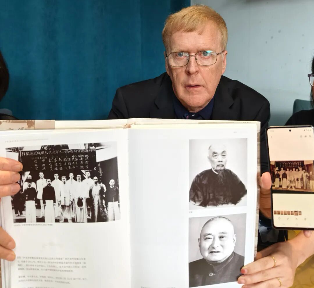△图中的国际友人是加拿大人易文,他展示的这张110年前的照片,是1914年泸县官绅和各国来宾合影,照片中前排右一即为泸州老窖温永盛作坊主温筱泉,而易文的祖父和外祖父也同列于这张照片中。