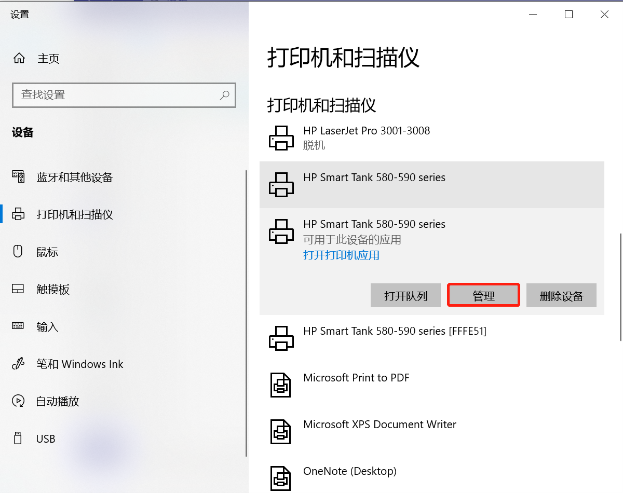 2.点击打印机图标,点击管理,打开管理设备页面,点击打印首选项进入,在打印首选项内点击布局,勾选手动双面打印,点击确定开启