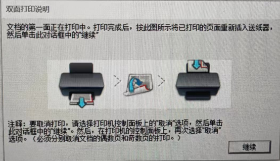 2.点击打印后,先出来一面内容,电脑会提示双面打印说明,按照提示操作,将第一次打印的纸张重新放入打印机进纸盒内(将纸张水平取出短边翻转180°放入进纸盒内)