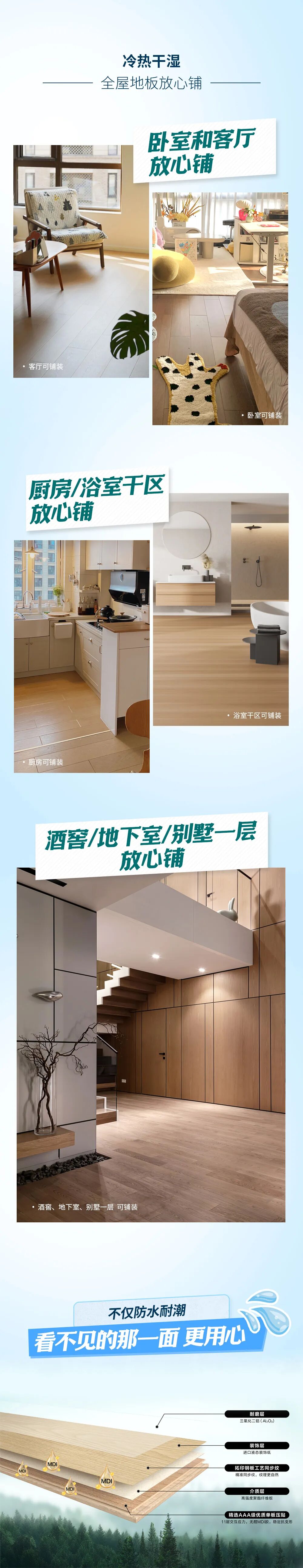 为了攻克“木地板怕水”这个难题,大自然研发团队历时3年潜心研发,重磅推出了“防水科技”,通过应用零醛智造“MDI耐水基材”、“防水型槽口”与“防渗漏锁扣”三重防水技术,由内而外地大幅提升强化地板的耐水稳定性。