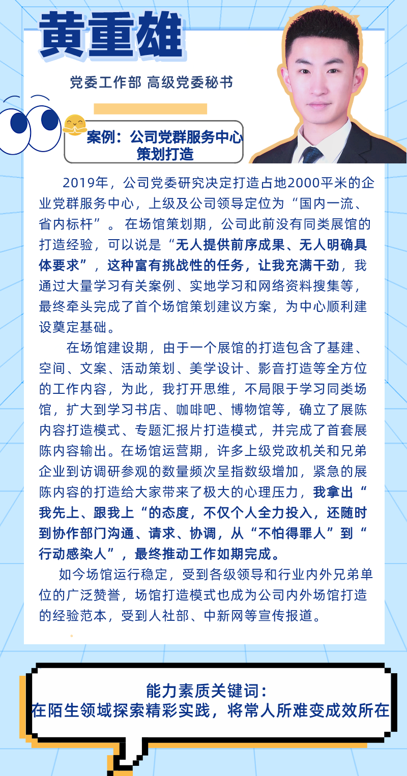 具备主人翁意识,主动挑起困难任务,不断为自己设立挑战性目标并克服困难予以达成,对工作有发自内心的热爱和责任感。