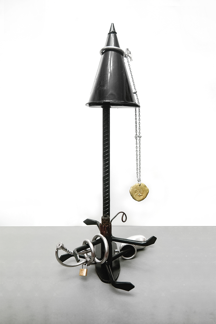 《感觉到生机》,铁、狗头金、贞操锁、塑料,2023