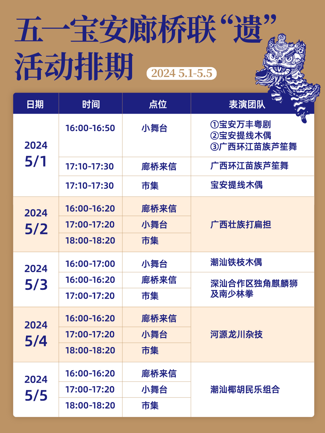 5.1-5.5 15:00-21:00,在E地块下沉广场,有非遗市集举办。各种创意摊位扎堆,逛一圈就get十足灵感!新文创品牌集结让传统艺术焕发新生,各种时尚潮物尽显独特魅力。