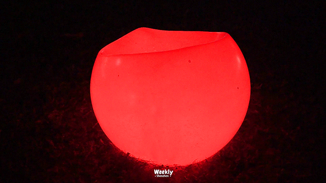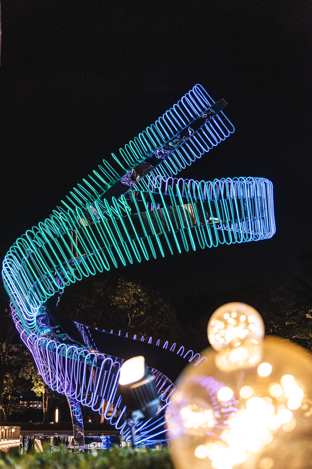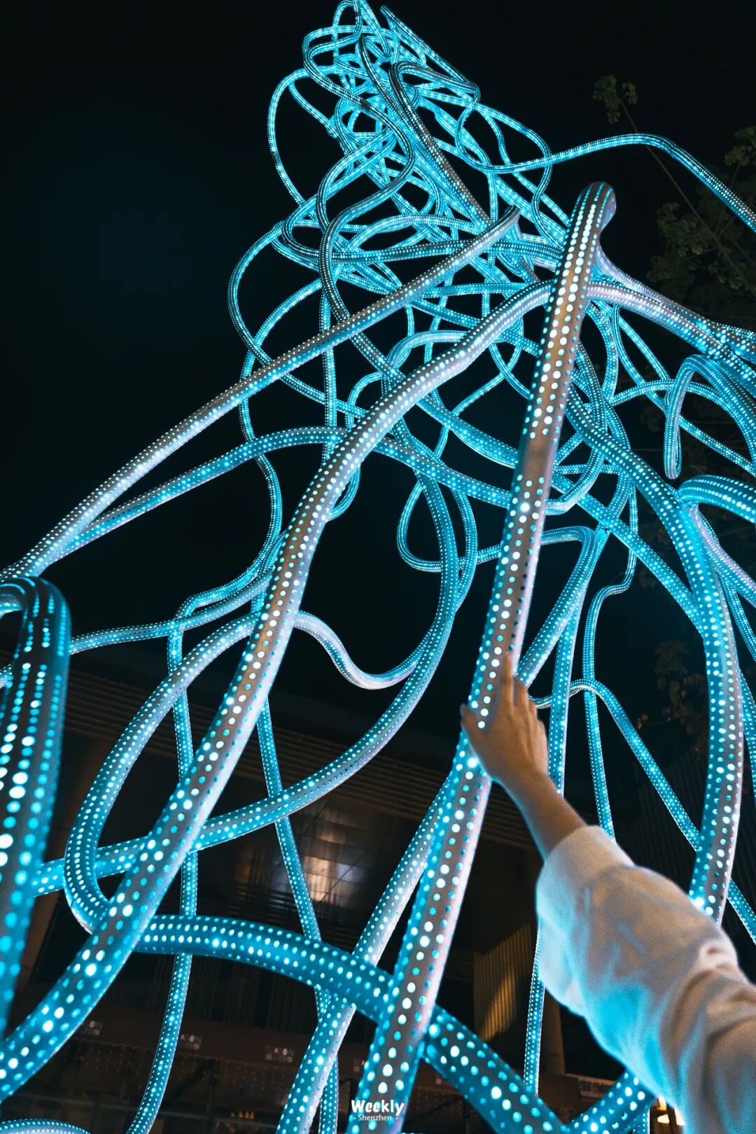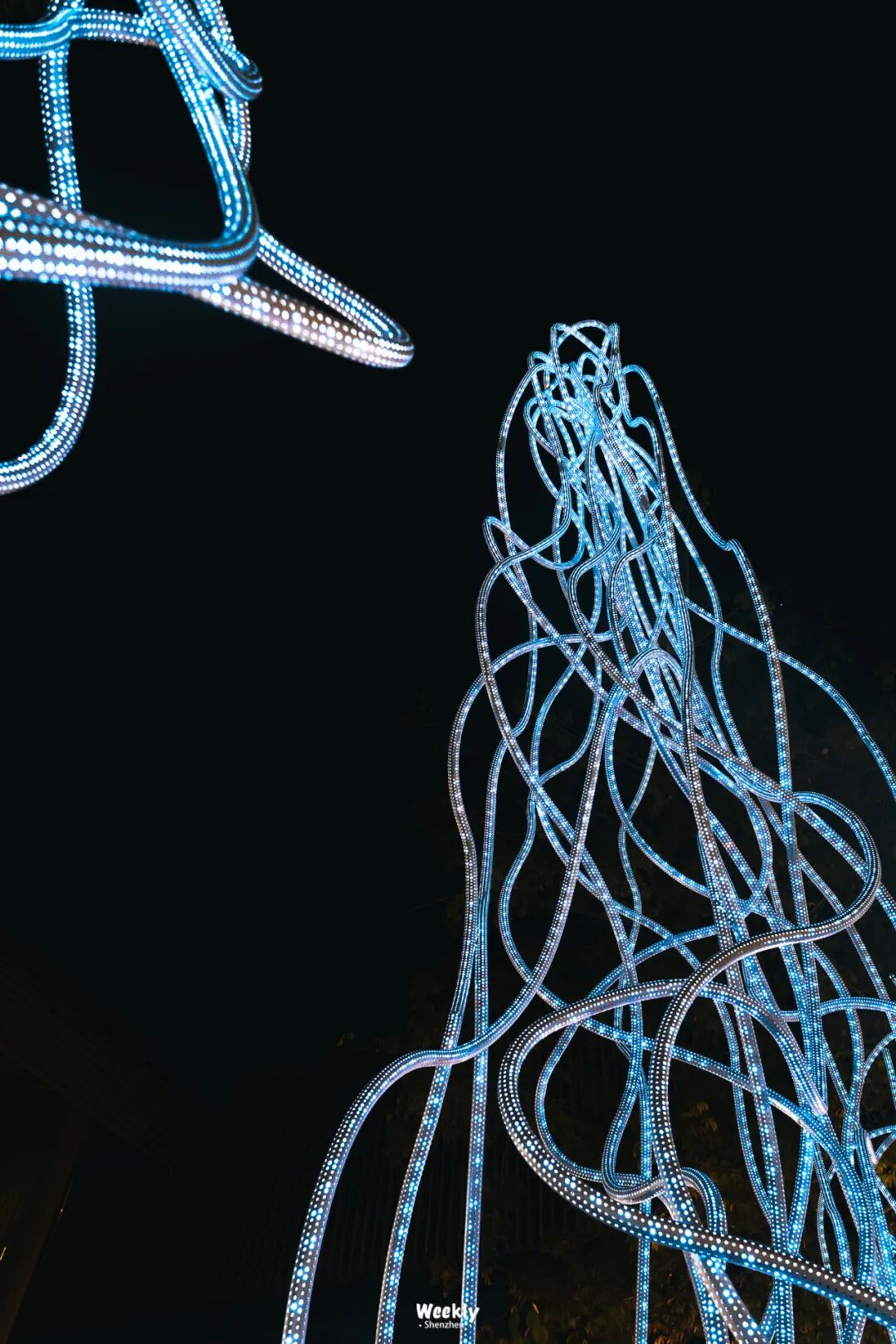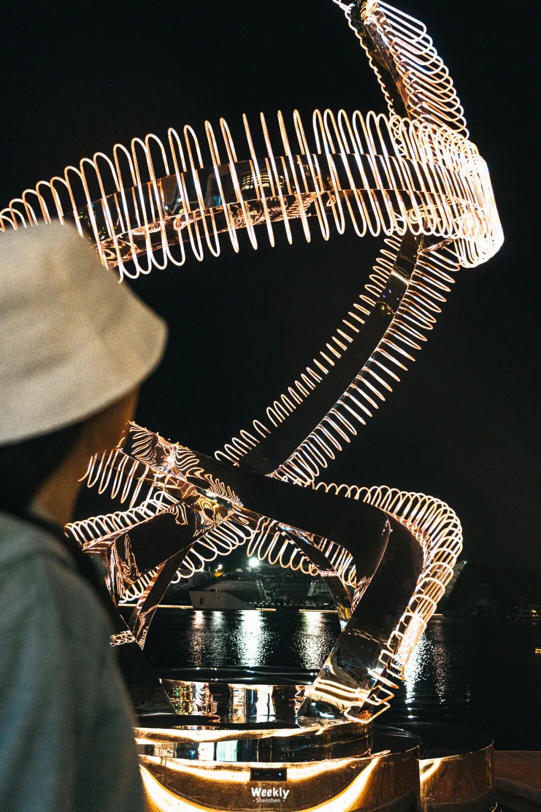 它像两条缠绕的丝带,顺着音乐蜿蜒而上,又像一束灯火,照亮夜晚湖边的浪。装置里暗藏体感装置,可以根据动作的起伏变换音乐和光效。