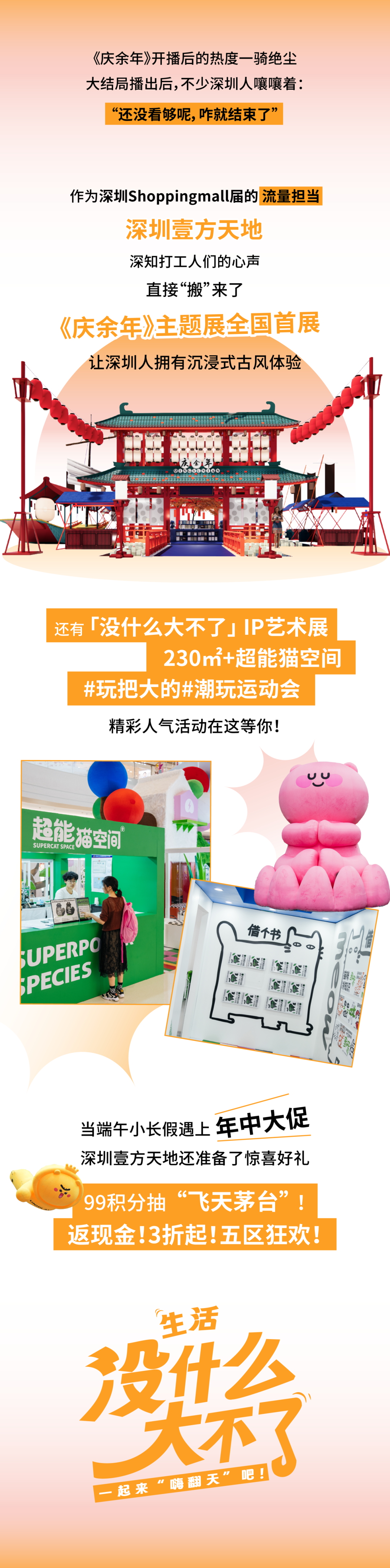 当端午节小长假遇上年中促,就成为全民狂欢的节日。为此,深圳壹方天地以「超能买手节4.0·没什么大不了」为主题,打造了一场专属深圳人的狂欢。