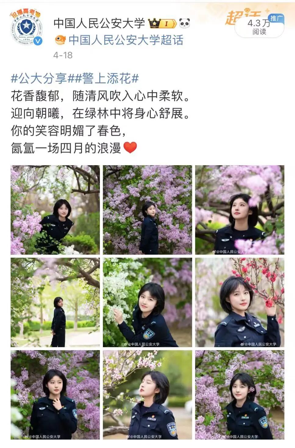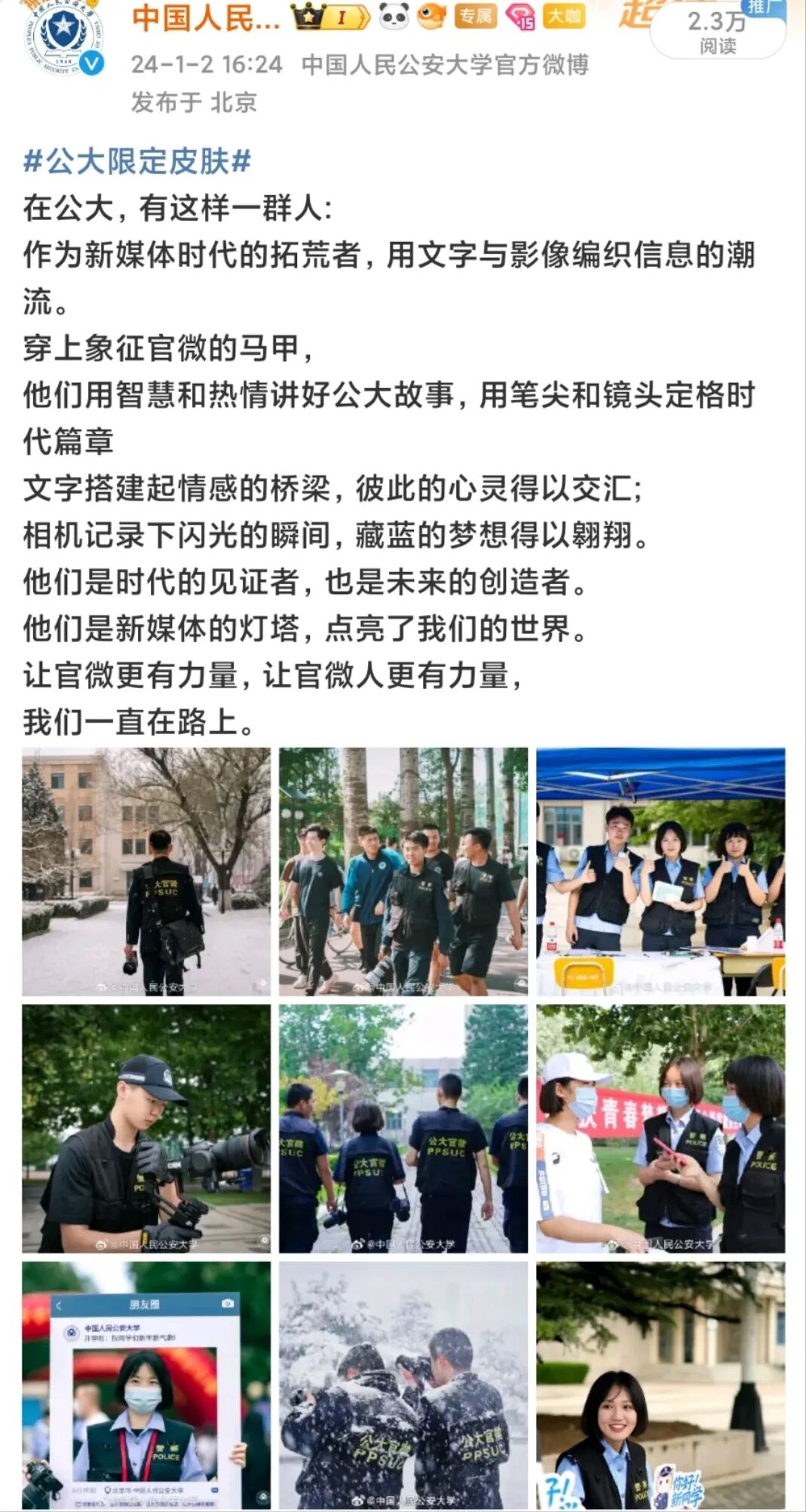 近年来,“公大官微”实现突破式跨越式发展,现已入驻微信公众号、抖音号、快手号、微博号、微信视频号、人民号、央视频号、哔哩哔哩、百家号等九大主流新媒体网络平台,构建起全网覆盖、全时响应的公安大学官方新媒体网络平台矩阵。作为发布学校权威信息、展示校园警营文化、展现公大铁军风采的核心窗口,目前公大官微已建设成为公安大学最重要的宣传阵地。