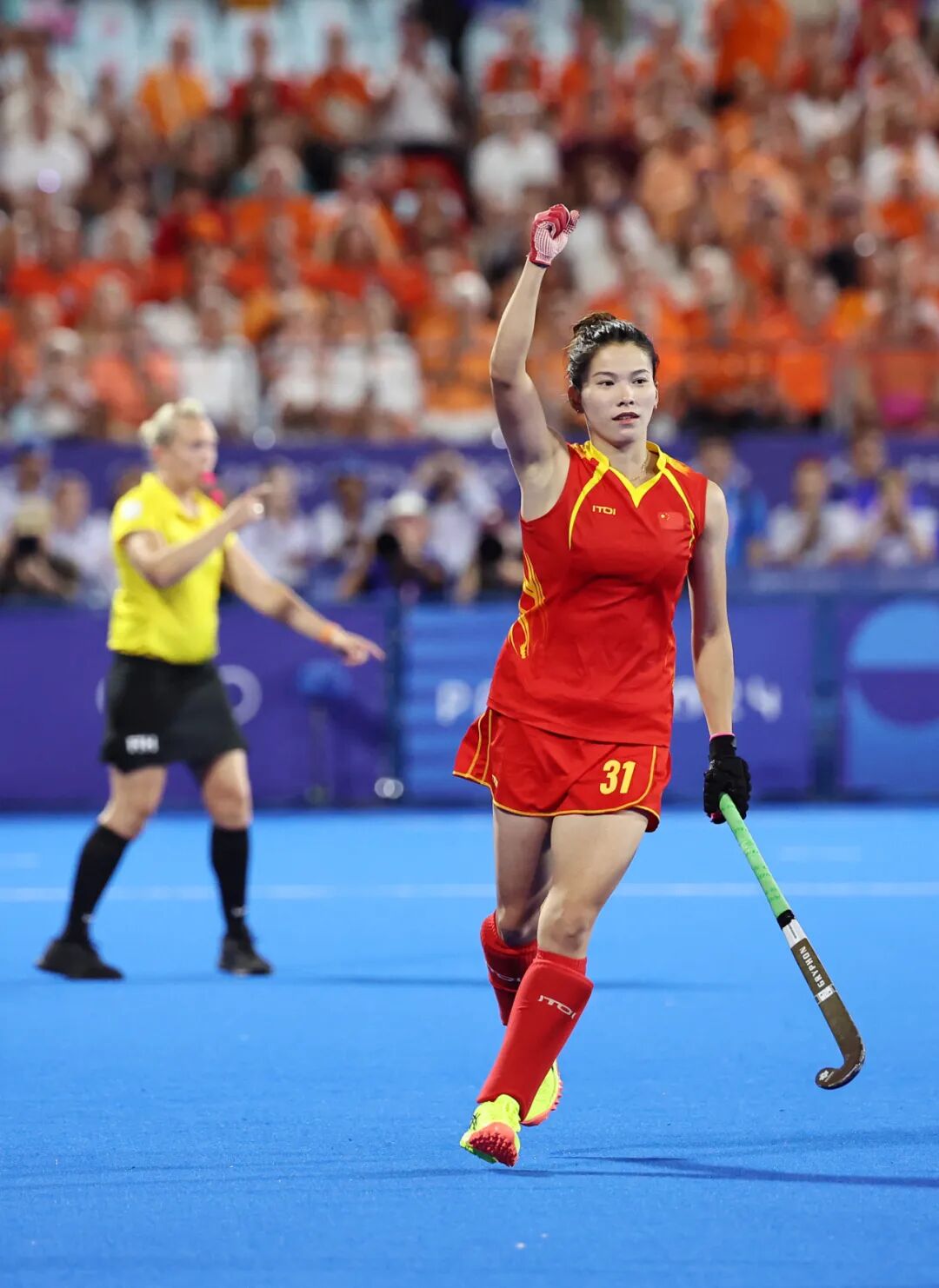 8月9日,中国队球员钟嘉琪(右)在23米球决胜中庆祝进球。新华社记者 任鹏飞 摄