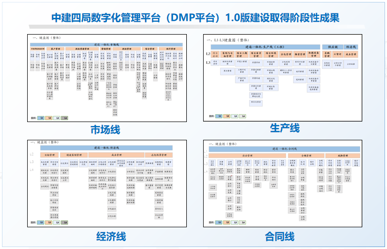 中建四局数字化管理平台(DMP 平台)1.0版建设取得阶段性成果,市场线、生产线、经济线、合同线、供应链线等核心板块正在上线验证,阶段性进展和成果获得集团领导认可。