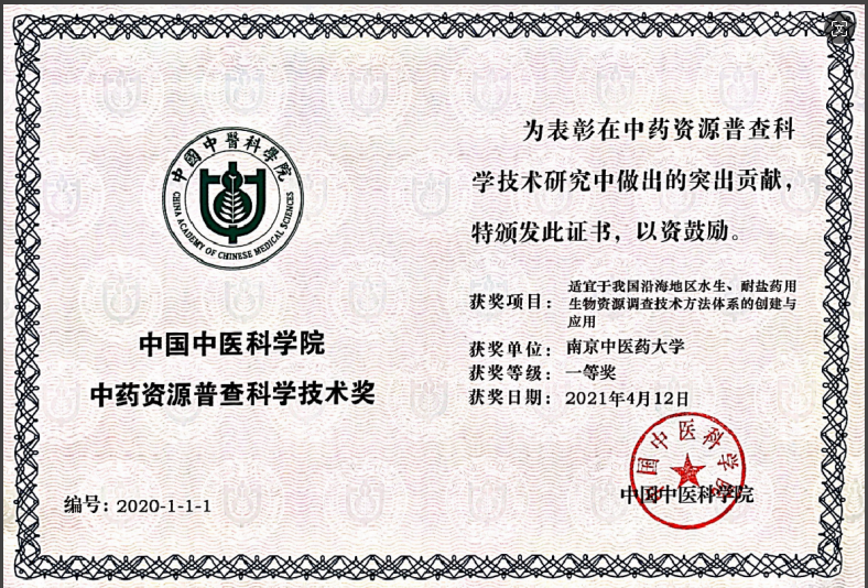 △南京中医药大学中药资源普查一等奖证书