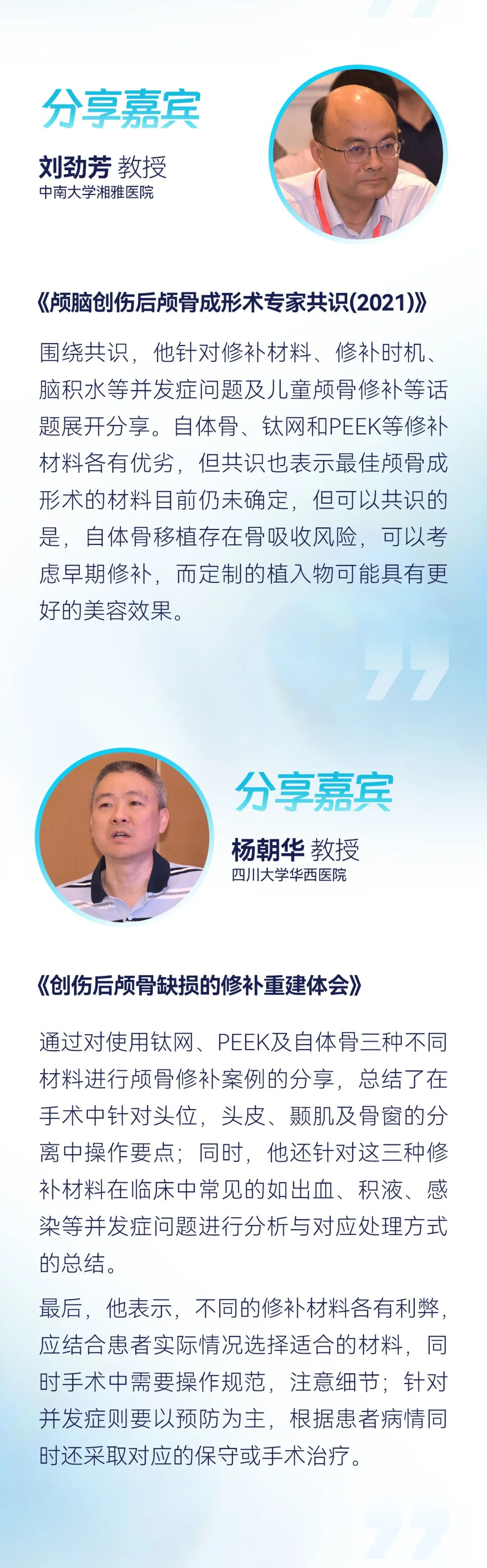 会议下半节,与会专家们则通过具体临床案例的分享展开对颅骨修补手术操作、材料等相关探讨。