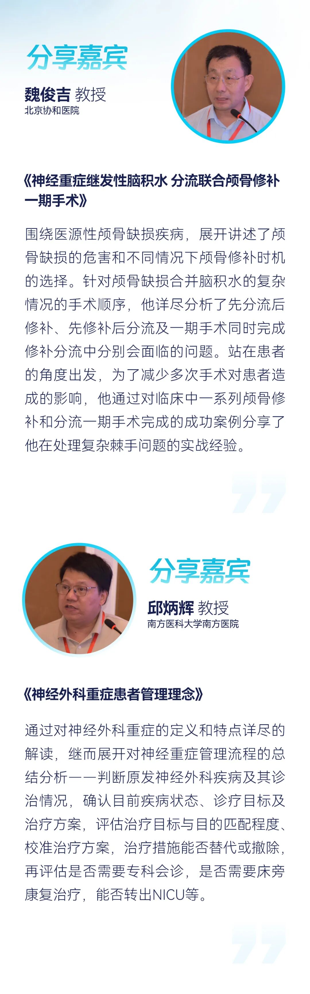 会议秉承“以人为本,求真求确”的学术宗旨,邀请我国颅脑创伤及神经重症专业领域的著名专家就颅脑创伤与神经重症最新的学术成就、多学科的合作理念等热点问题展开探讨,共识详细解读相关疾病的最新诊疗进展,分享临床实用类知识和技术。