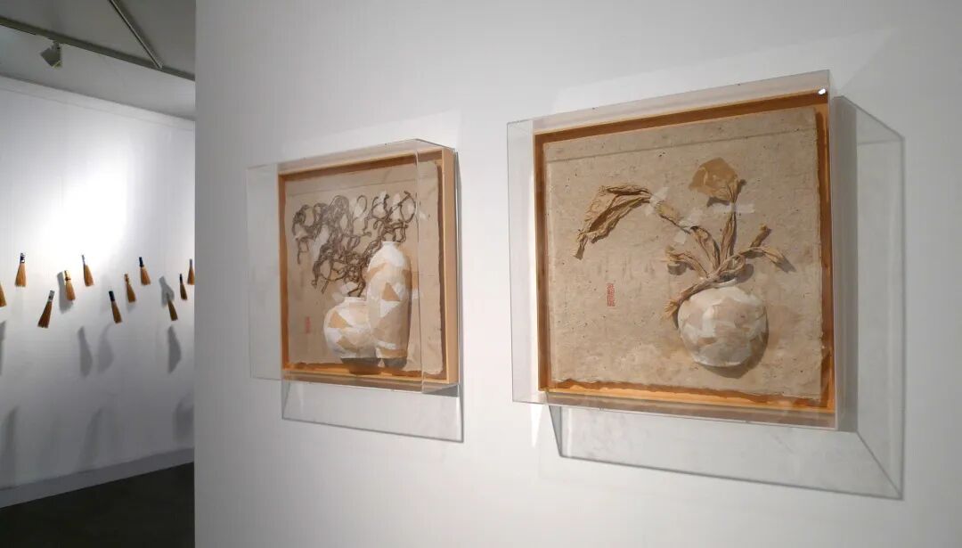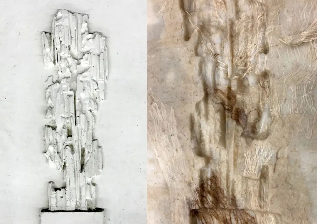 花朵、香蕉皮、海苔、眼影、羽毛、丝线…缤纷猎奇的材料是原博手工造纸课上同学们脑洞大开后的灵感;烘焙模具、吸尘器、化学滴管、丝网版等意想不到的工具出现在她教学的试验场;剪纸、蜡染、雕版等传统工艺总以全新的形态出现在课堂和工坊。生活中常见的物品与意料之外的材料、工具、工艺相互碰撞,撞出一场场纸张艺术的交响乐。原博对学生最常说的两句话就是“摸着石头过河”和“水到渠成”,前者是历经反复的思考与尝试,后者便会成为一种必然。