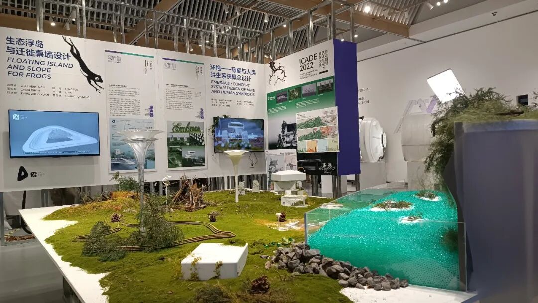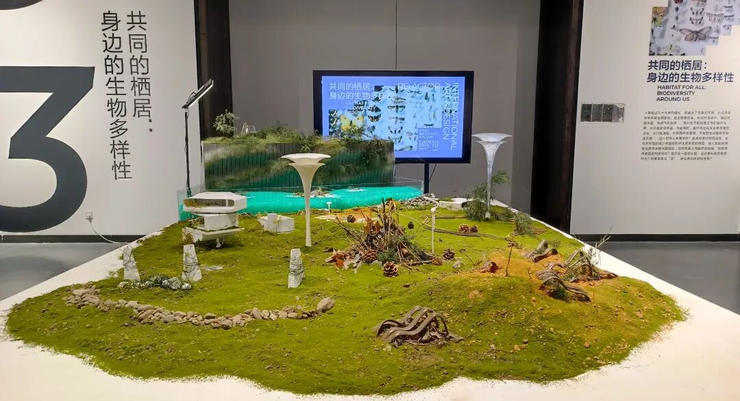 “共同的栖居:身边的生物多样性”主题展览上,《城市切叶蜂共生设计》《城市环境下的本杰士堆再设计》《生态浮岛与迁徙幕墙设计》《环抱——藤蔓与人类共生系统概念设计》四件作品用艺术设计介入未来的城市更新和生物多样性保护的生态课题。借助产品设计、景观设计、环境艺术设计、建筑设计等多样的设计手段,四件作品分别从为蜜蜂设计踏脚石生境、为城市中的小动物设计栖身之所、对清华校河进行生态改造和让人类生活与爬山虎相拥的反思设计出发,探讨城市中人与其他生灵生存环境之间的边界和距离感问题,为生物多样的栖息地设计融入城市的规划建设提供了灵感、方向以及探索路径。用艺术设计赋能生态建设,小生灵们得以与忙碌的都市人共享同一片土地,与人类一起自在栖息、共生共荣。