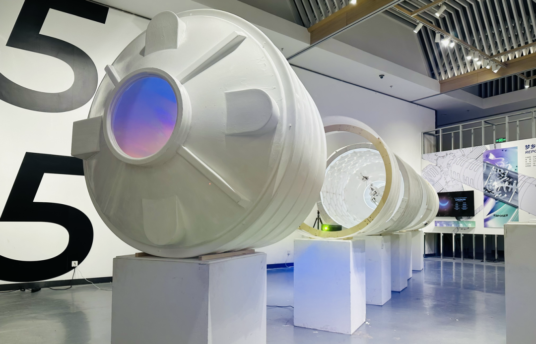 作为对该虚拟课题的回答,四节巨大的“太空舱”便横跨在“地外之家:太空建筑与交互”主题展览的空间中央,它们分别代表着太空的冥想室、冰球场、花园以及睡眠舱。来自环境艺术设计、信息艺术设计、数据科学等不同专业的主创同学们聚在一起,共同设计了这四节未来的太空舱:未来的宇航员需要一间冥想室,冥想室中狭小幽闭的舱体环境可以借助参数化的建筑声学结构产生出或广阔无垠、或空灵清幽的不同声音效果,以此实现心灵的慰藉和疗愈;还需要一个运动场,于失重环境下的冰球场上驰骋一定拥有更加极致的体验和更加独特的趣味;宇航员们或许还会有一座空中花园让他们午后踱步,观察地球上的木本植物会如何在有序的光照和无序的太空环境中生长;当然也一定会有一间睡眠舱,但新型的睡眠舱将更加智能和具有安全包裹感,宇航员们可以在其中舒服地好梦一场。四节“太空舱”也即四件作品,既饱含艺术的想象力,又具有科学的严谨性,是主创同学大胆想象、小心求证的结果,更是艺术和科技在太空中碰撞出的火花。