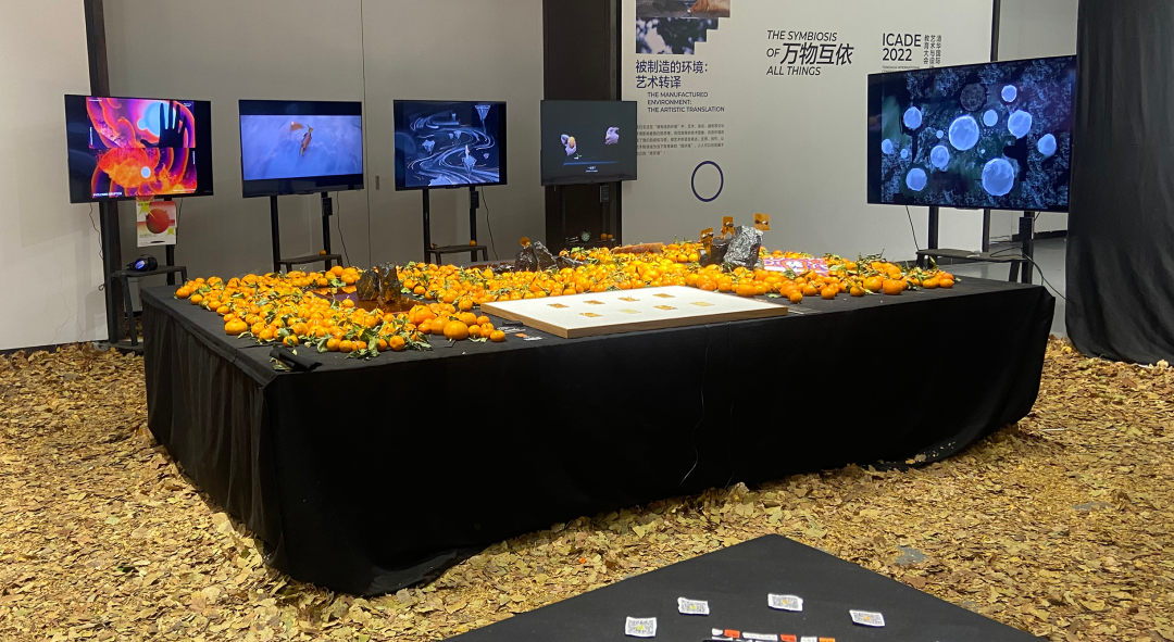 展场上,《橘子猫》《橘电感应》《橘生不息》《表皮-呼吸》《景观,乐园》等15件极具创造力和艺术性的作品集中亮相,从触觉、味觉、视觉、听觉的不同感官角度解读秋天,传达创作者们由简单的橘子出发所产生的深远体悟与思考。有的从橘子之于秋天的感知出发,通过装置艺术、绘画、行为影像等不同形式描摹橘子在呼吸、触摸及提纯等不同层面、不同过程中给人的感知;有的将橘子作为艺术转译的语言,从微小走向宏大,从具体进入抽象,表达创作者们对人与物、物与情的理解;有的通过橘子与他物的交互,将橘子作为自然的代表串联起人、自然和工业的关系,进而探讨万物互联互依的主题;还有的从橘出发,通过大的时空和世界环境的构筑表达情感、分享思考。15件作品都既有思考又有实践、既有艺术创造力又有技术拓展性。从感觉到思考实践再到展示,艺术创作与科学技术在每一件作品中交相呼应、相得益彰。