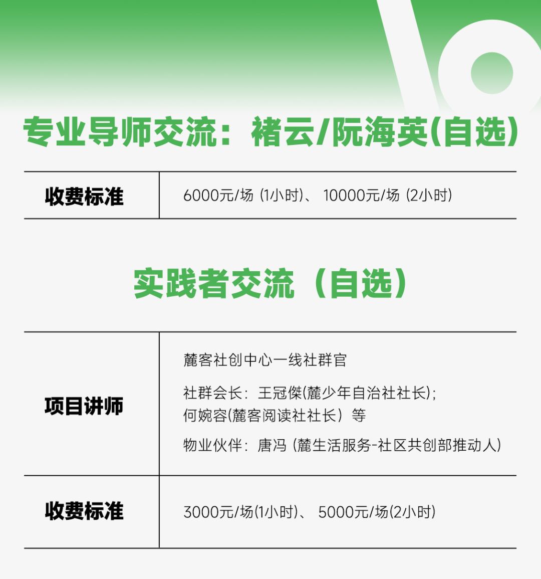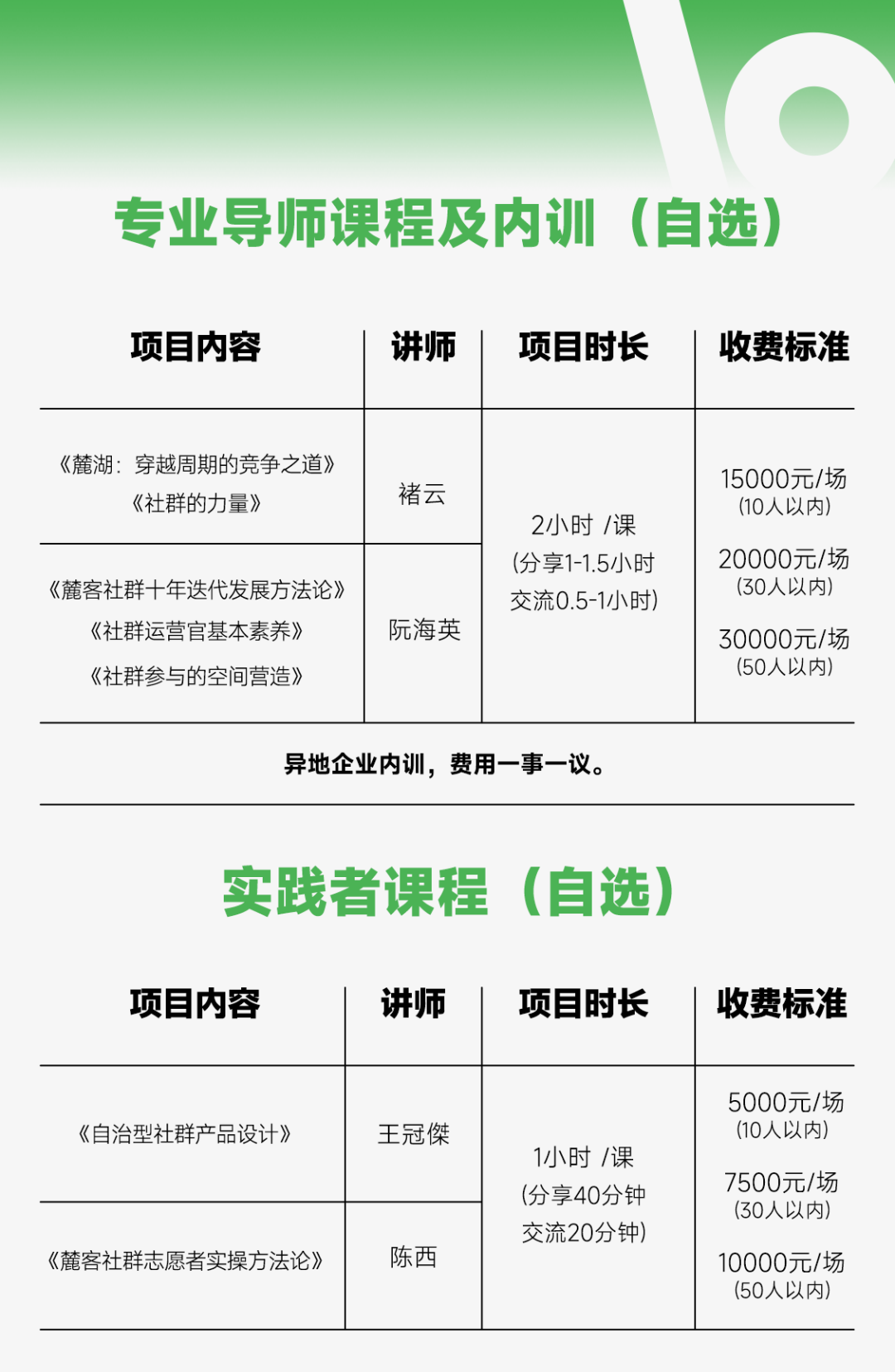 授课+交流,主要为一线社群官共学营、高管研修班等麓湖内部讲师课程。