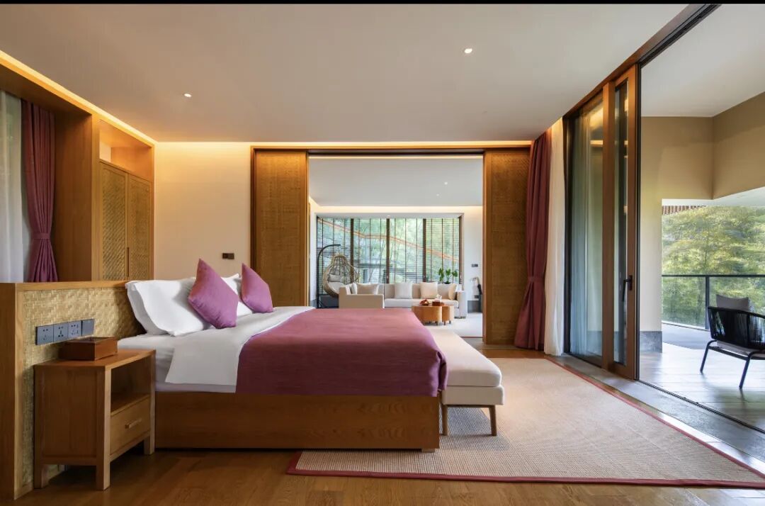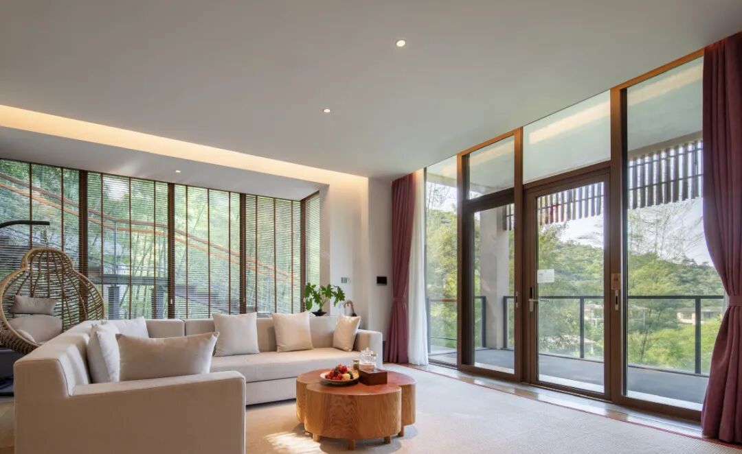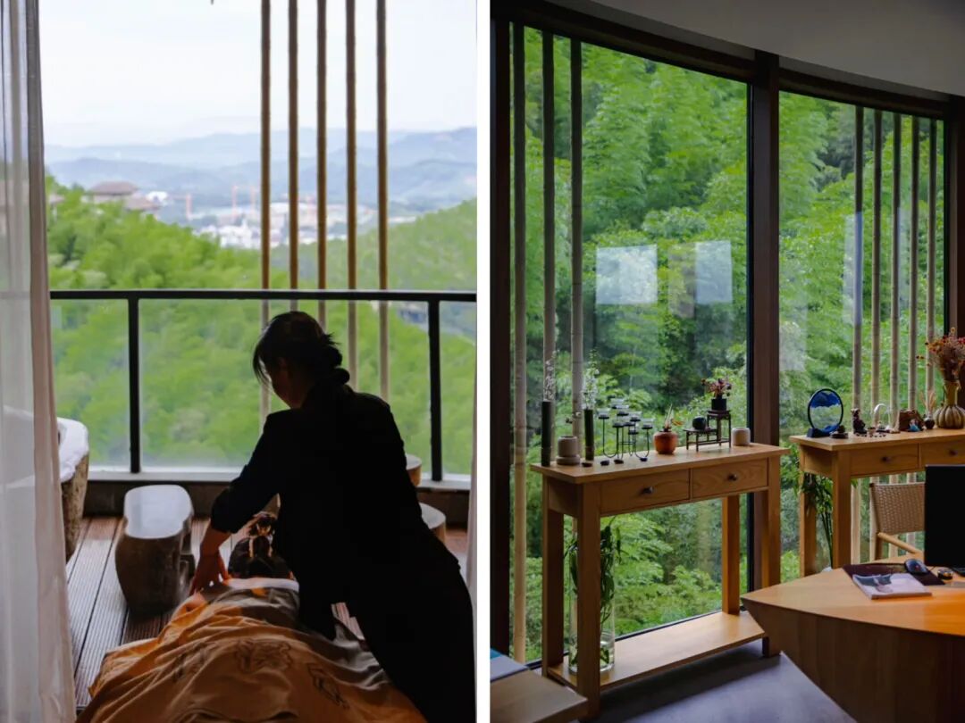竹溪谷把客房分成了茶、棋、文、艺、花5种主题,风格不尽相同。但每一间,都毫不吝啬地用上一整面落地窗,为的就是最大限度地让你融进自然里。