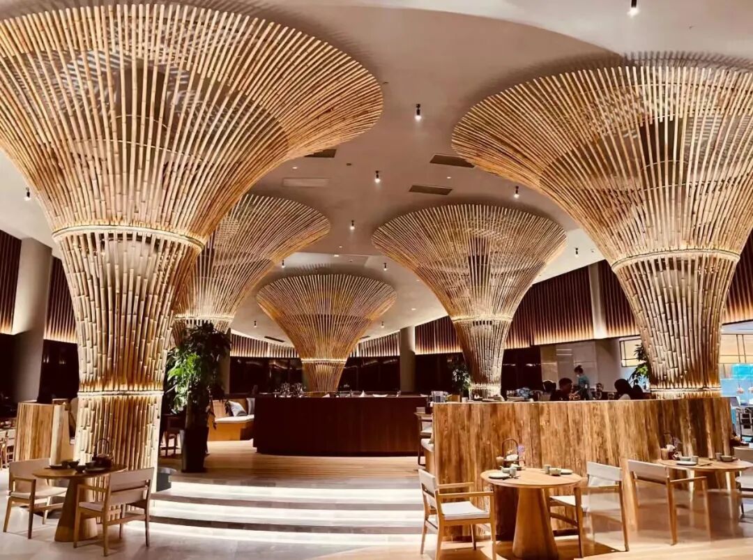 溧阳御水温泉竹溪谷酒店的竹轩餐厅也是一栋独立建筑,以湖为邻,与竹林作伴,整体的建筑造型就像是一座漂浮在湖面上的悬浮餐厅。