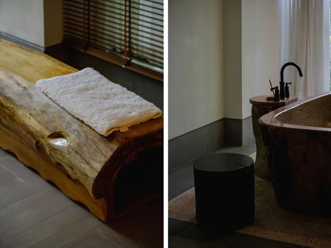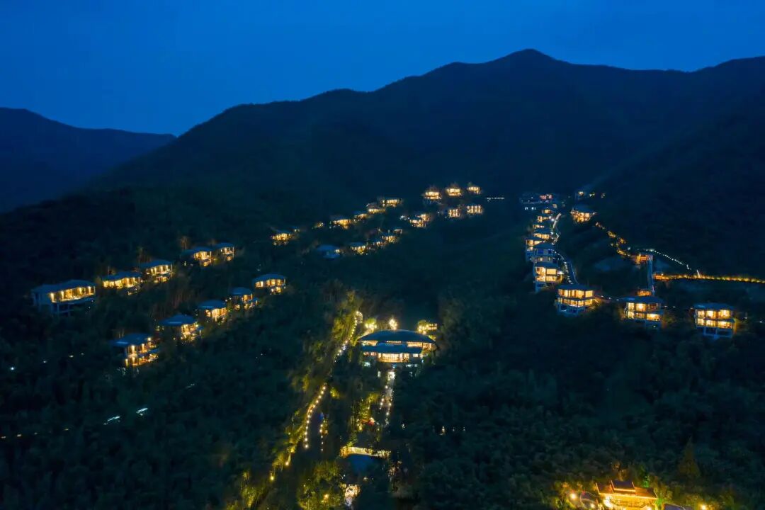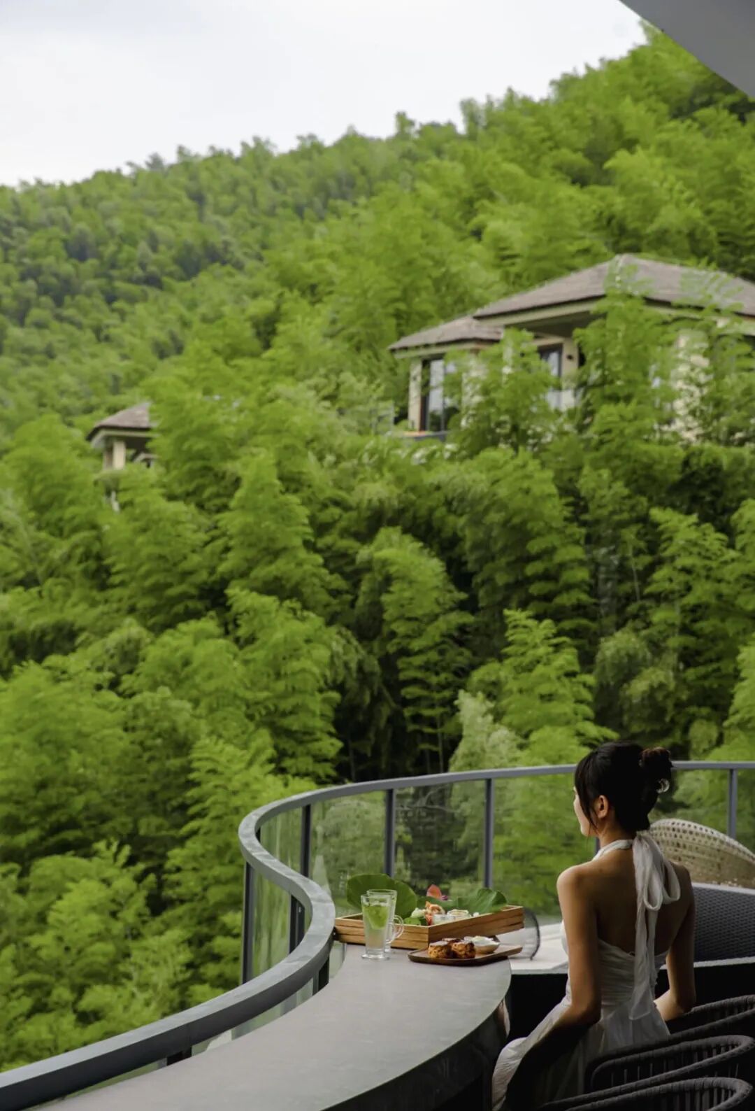 酒店耗时3年打磨,打造了50栋全竹景独栋式客房,在山峦峡谷间呈U字型错落分布,日出日落、晨辉晚霞都能在户外露台沉浸式观赏。更值得一提的是酒店每间房都带有独立私汤,取自地下天然温泉水。