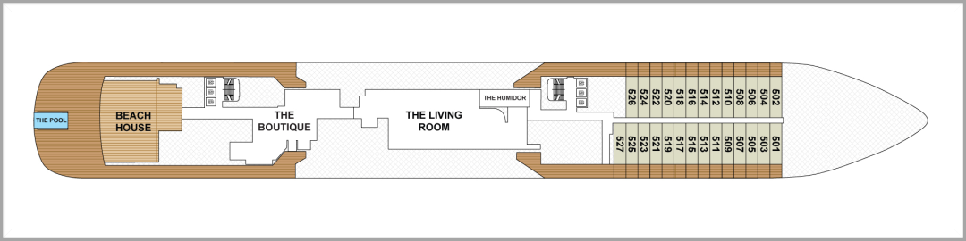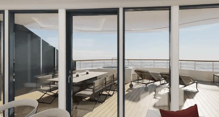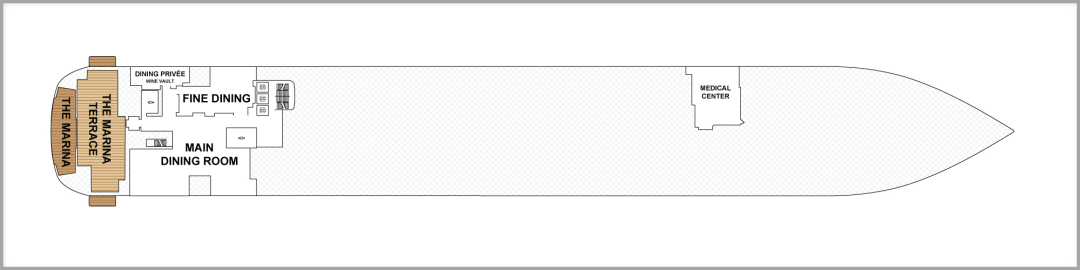 处于这一层的船尾部分还有一个命名为 “Marina” 的亲水平台,当船只抛锚停泊时,客人可直接跃入海中进行各种刺激的水上活动。
