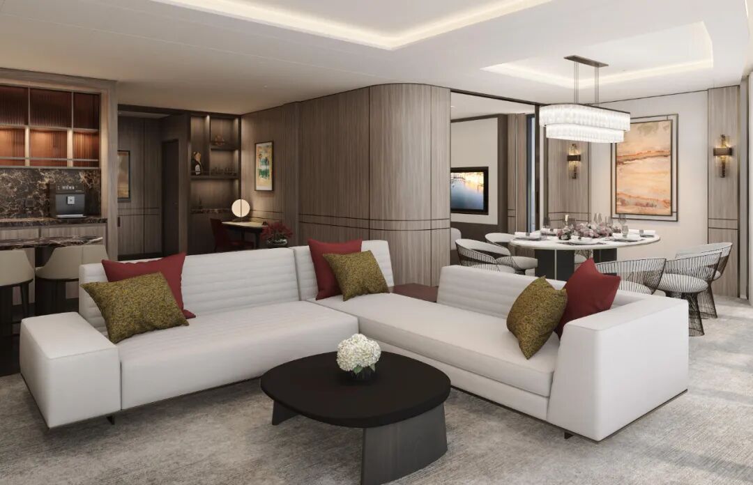 套房室内的起居空间光线通透,配有鸡尾酒吧和宽敞的用餐区域。