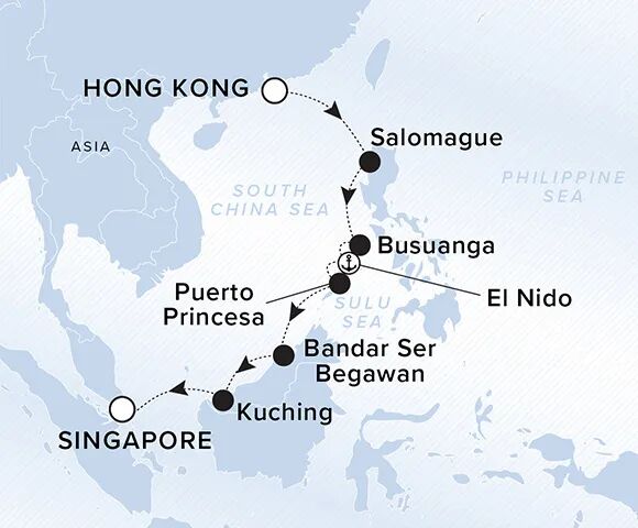 13D12N的香港-新加坡航程途径的目的地和来时的不太一样,它经过的是:菲律宾(萨罗马格港、巴拉望的科隆岛、爱妮岛、公主港)、文莱(首都斯里巴加湾)和马来西亚(古晋)的多个城市。