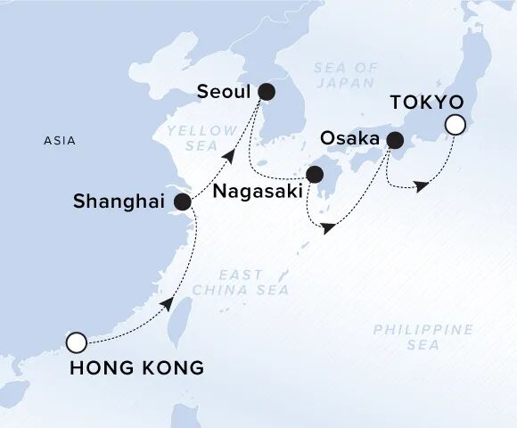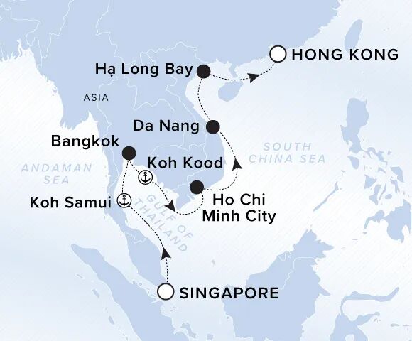 15D14N的航程起始于新加坡,终结在香港,一路会途径:泰国(苏梅岛、曼谷、阔骨岛 Koh Kood)和越南(胡志明、岘港、下龙湾)的多个城市。